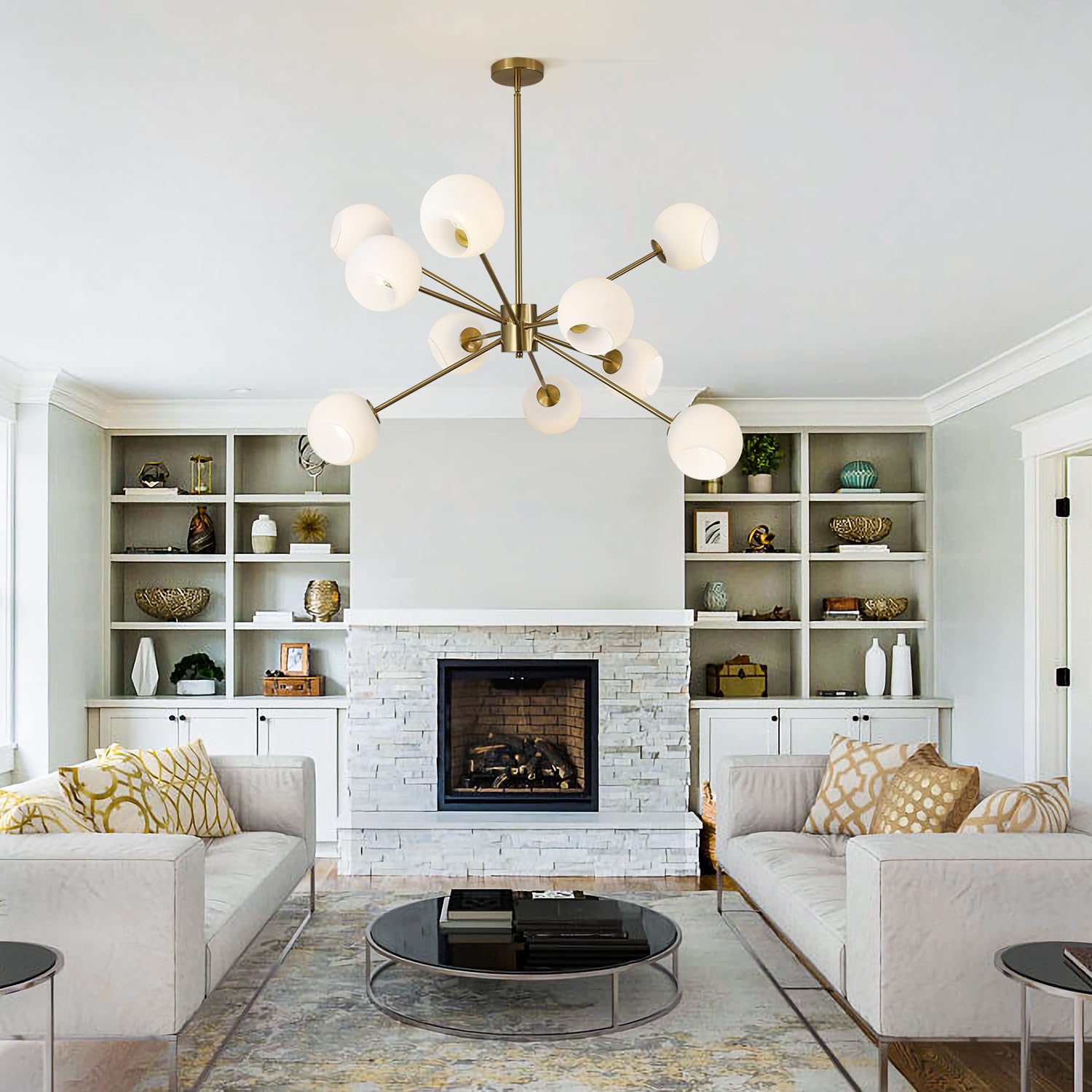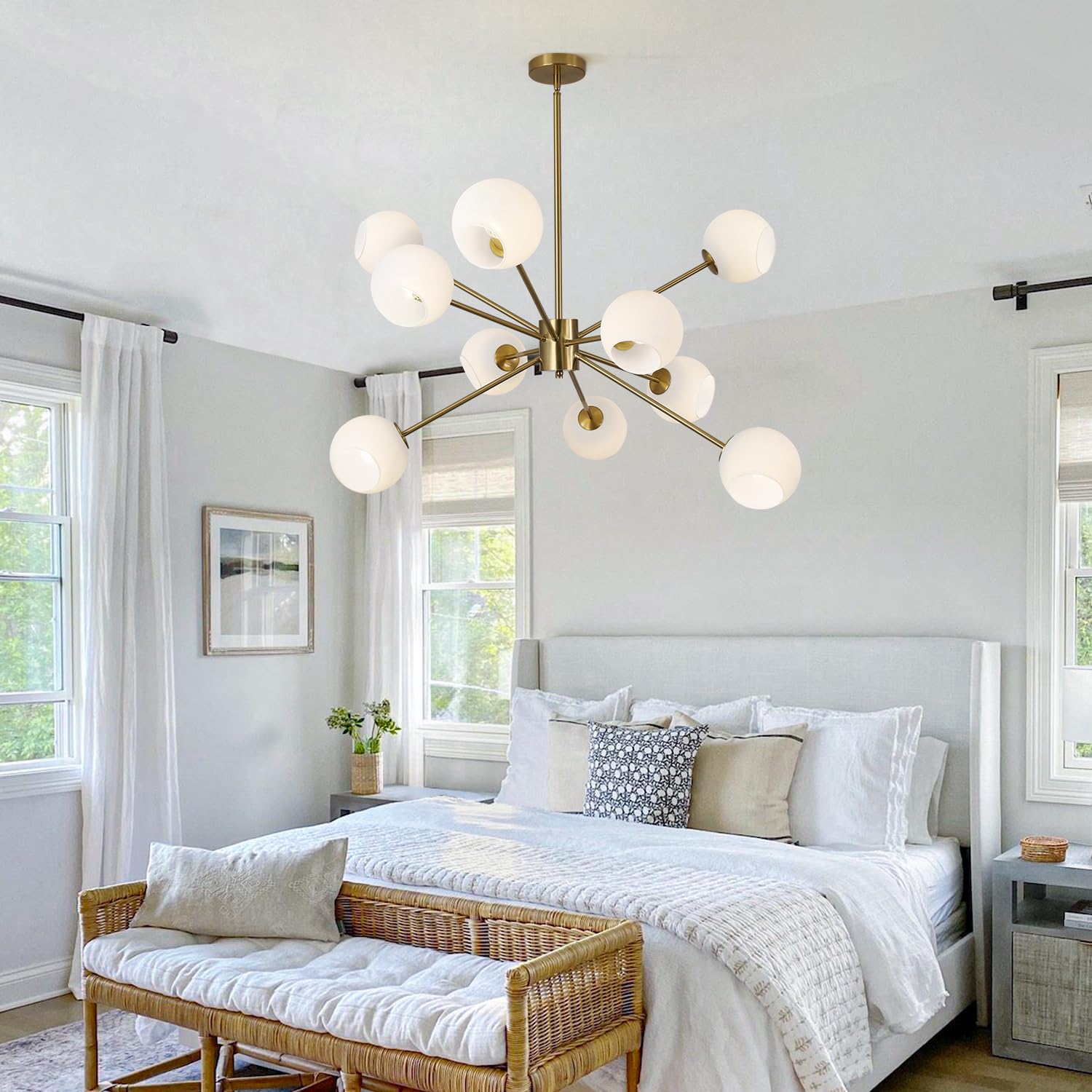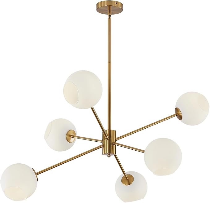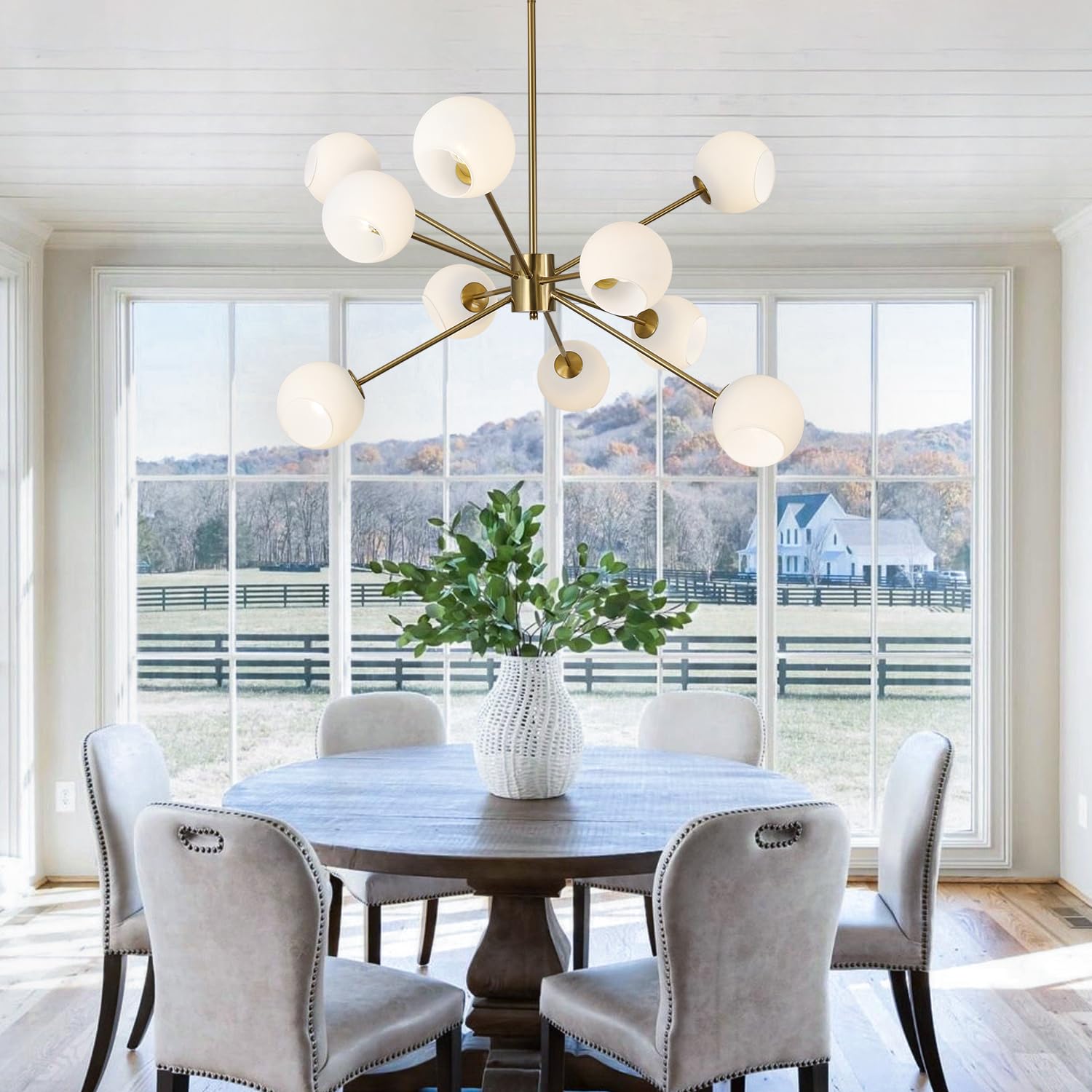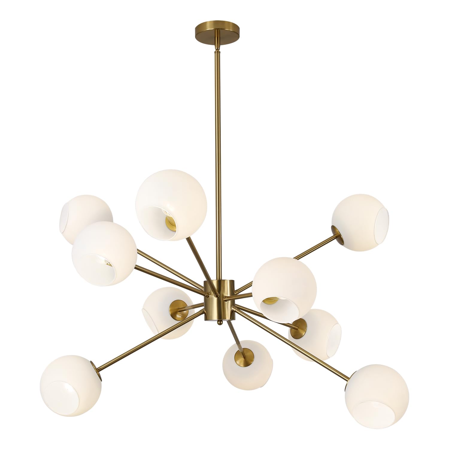 - The large milk glass chandelier measures high quality brushed brass lamp body, mid century modern style. The gold chandelier of 10 lights with open frosted white glass globe design is beautiful and unique.
