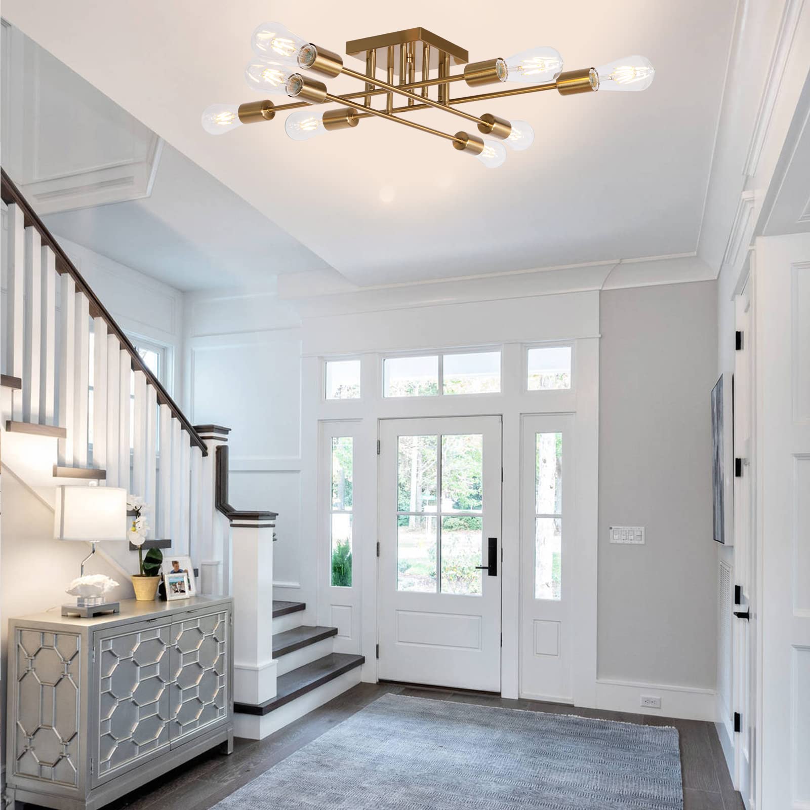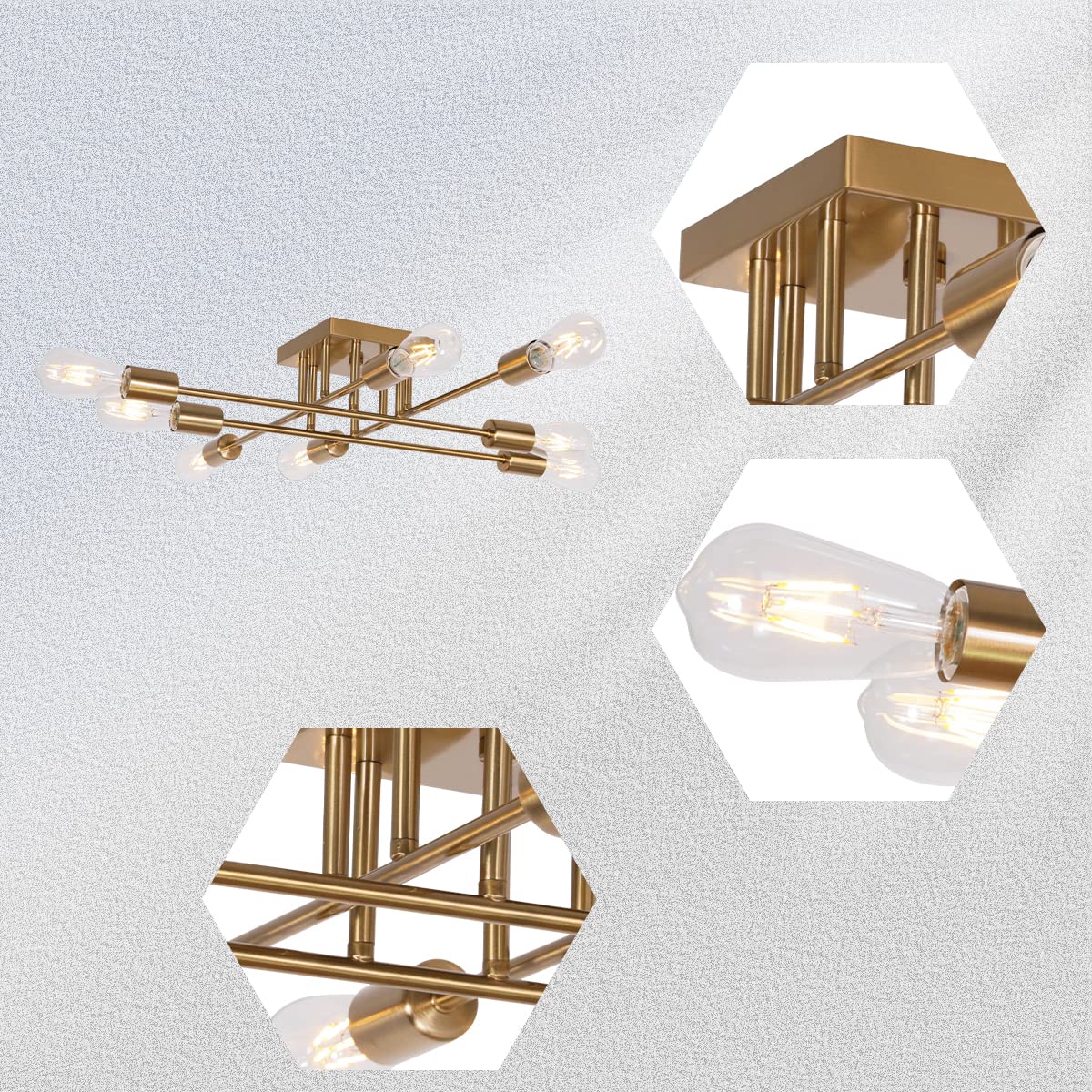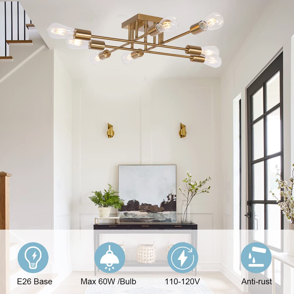 Modern Ceiling Light Brushed Brass 8 Light Mid Century Sputnik Chandelier Semi Flush