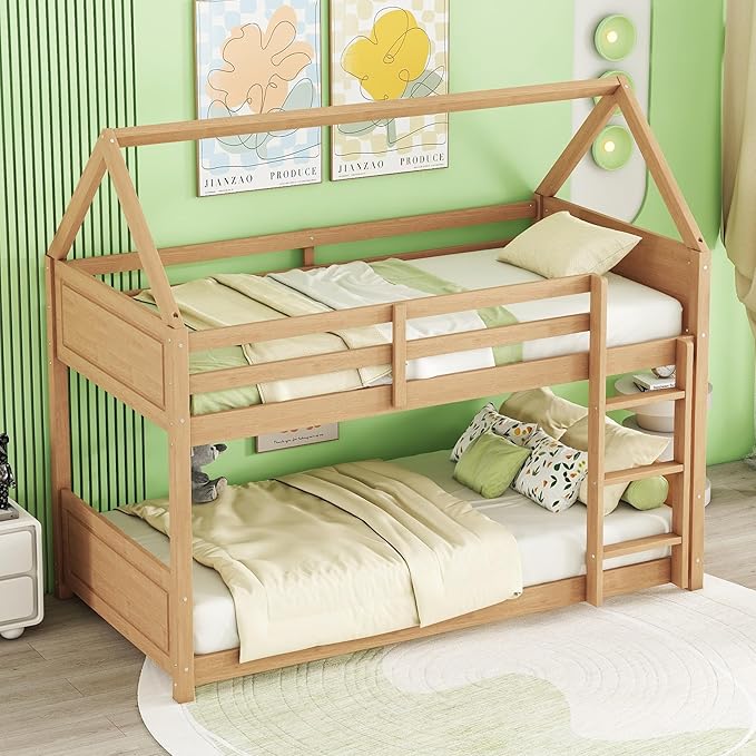 Twin Over Twin House Bunk Bed for Kids, Wood Floor Low Bunk Bed Frame