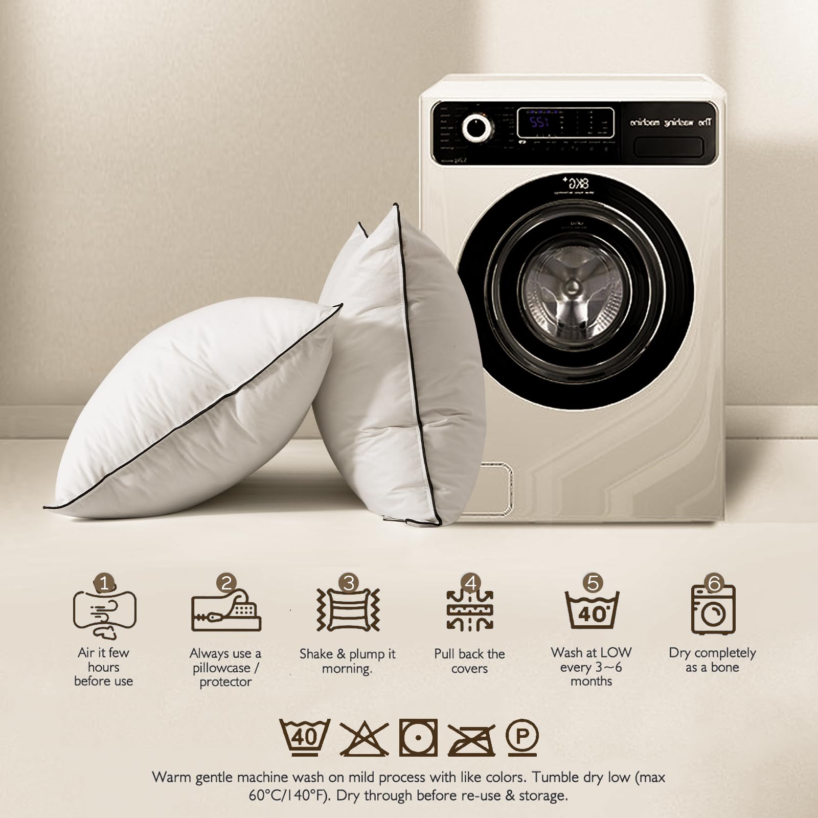 - - Each set consists of two feather down pillow inserts. Our feathers & down pillows are available in standard size 20"x26", queen size 20"x30", and king size 20"x36". Piped for style and durability. Machine washable and dryable. Maintains shape and fluffiness after many washings.