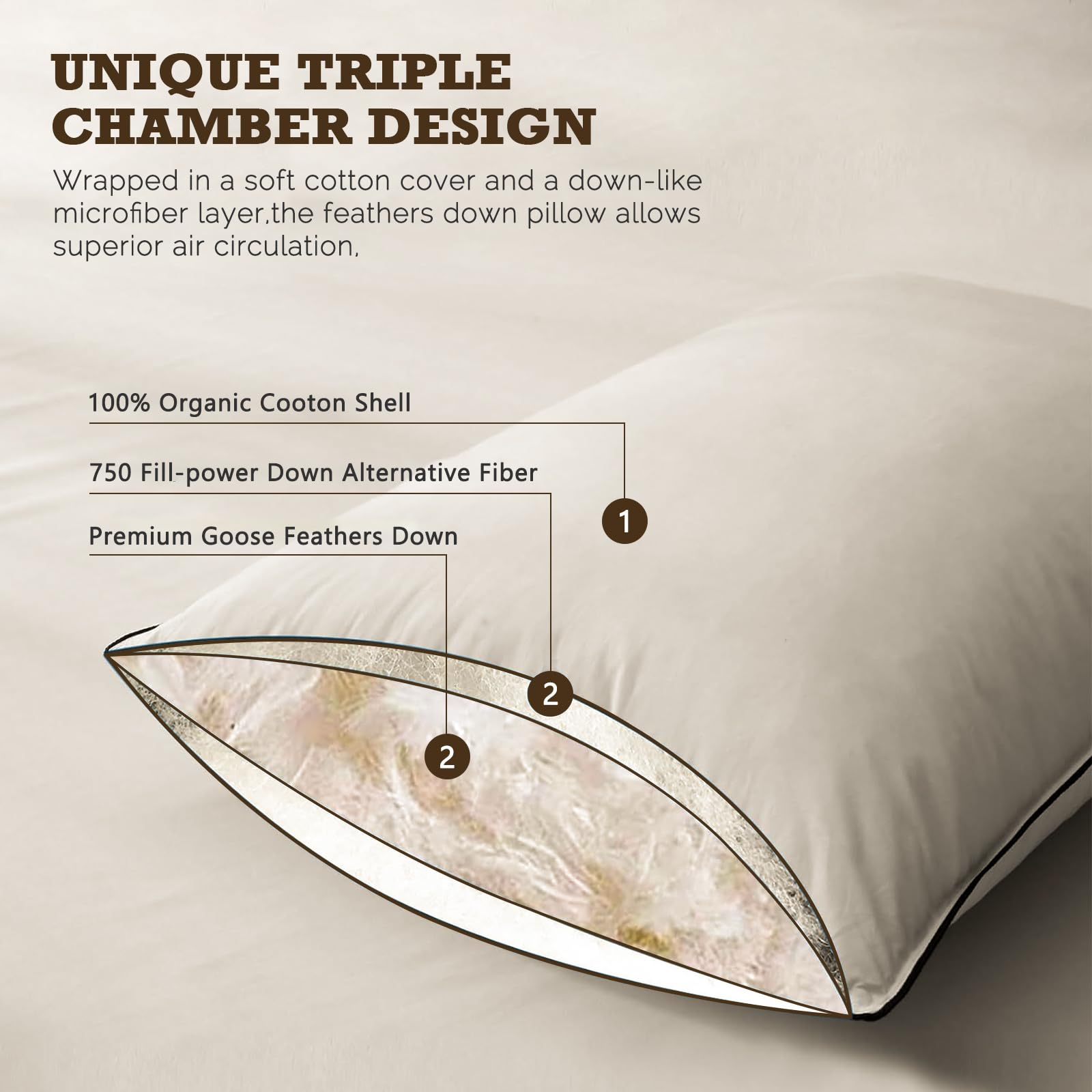 - 3-Chamber Feather Down Core Pillow Surrounded by Polyester and 100% Organic Cotton. The unique design allows the cooling bed pillows for sleeping 2 packs for superior air circulation, preventing overheating and promoting a cool and comfortable sleep experience.