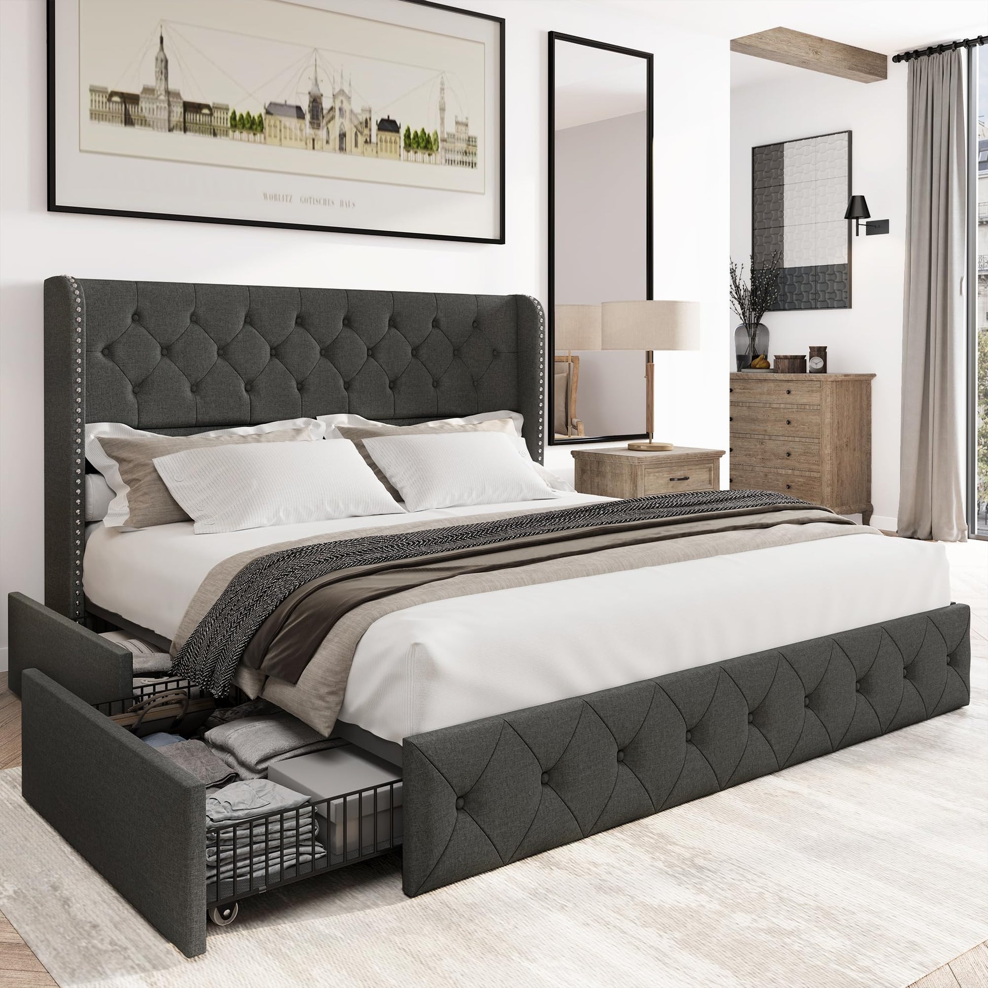 - Linen bed frame with natural colors and subtle texture blend seamlessly with various design styles, from minimalist to rustic. the timeless elegance of king size bed frame with drawers adds a touch of sophistication to any bedroom setting