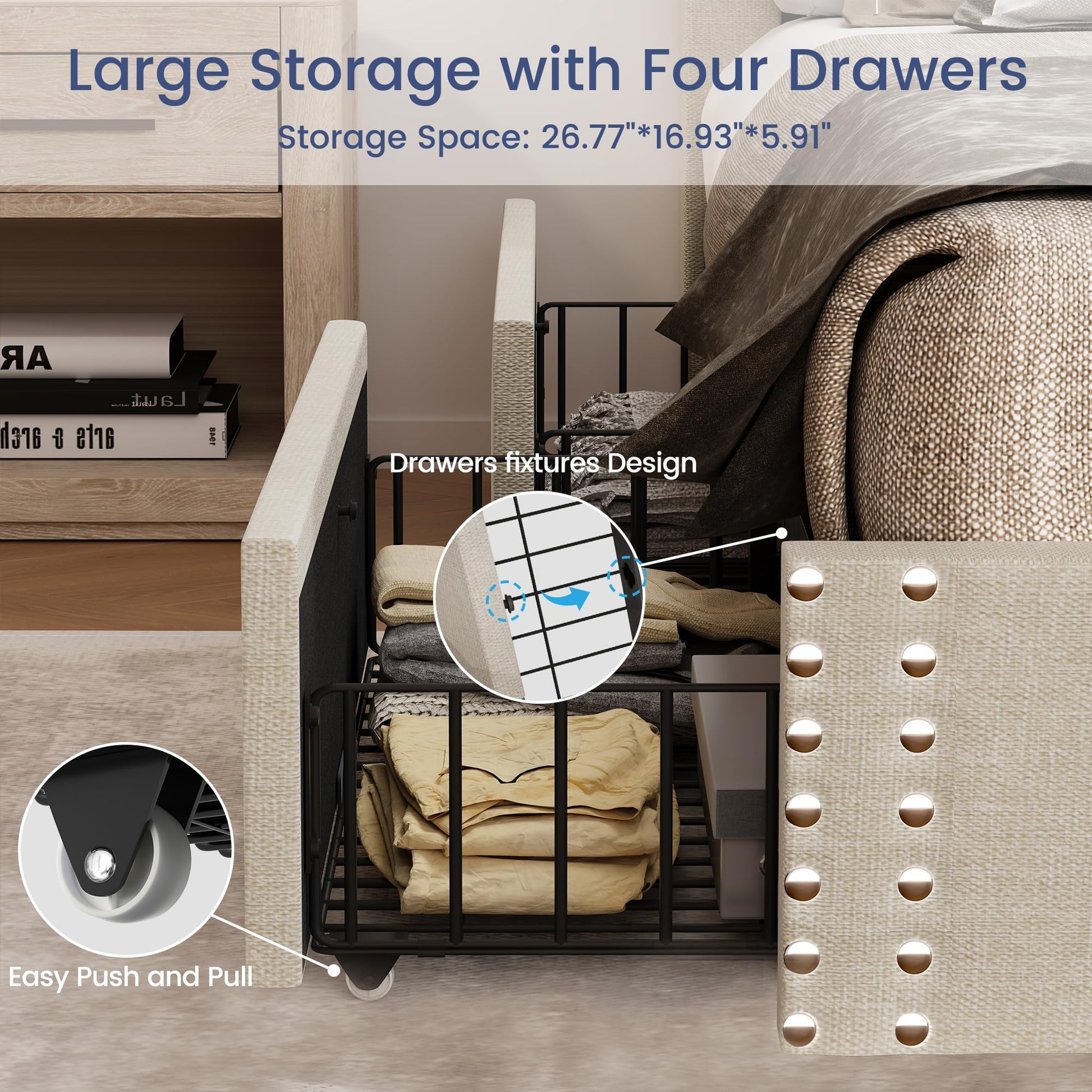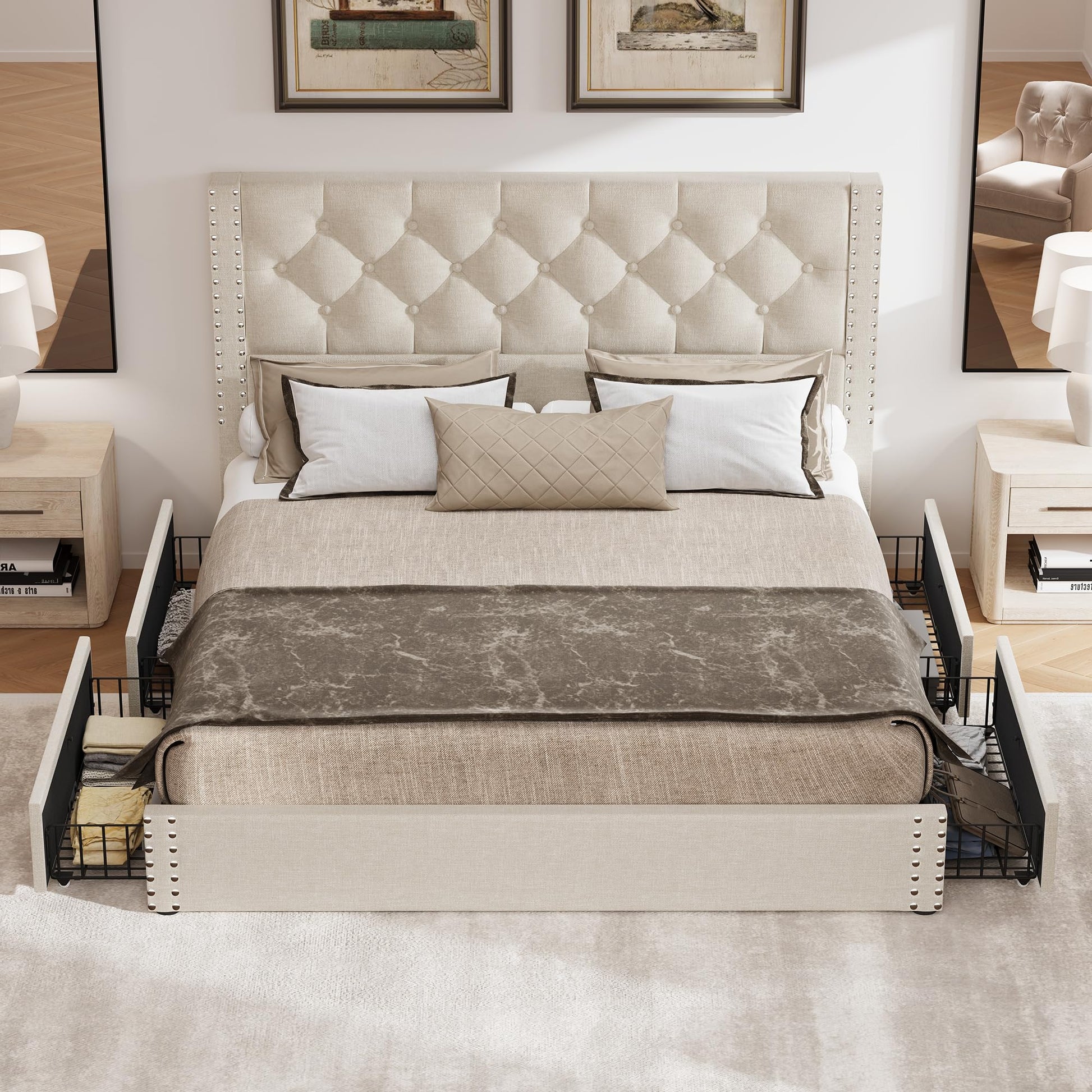 Queen Bed Frame with 4 Storage Drawers,Linen Upholstered Platform Bed Frame