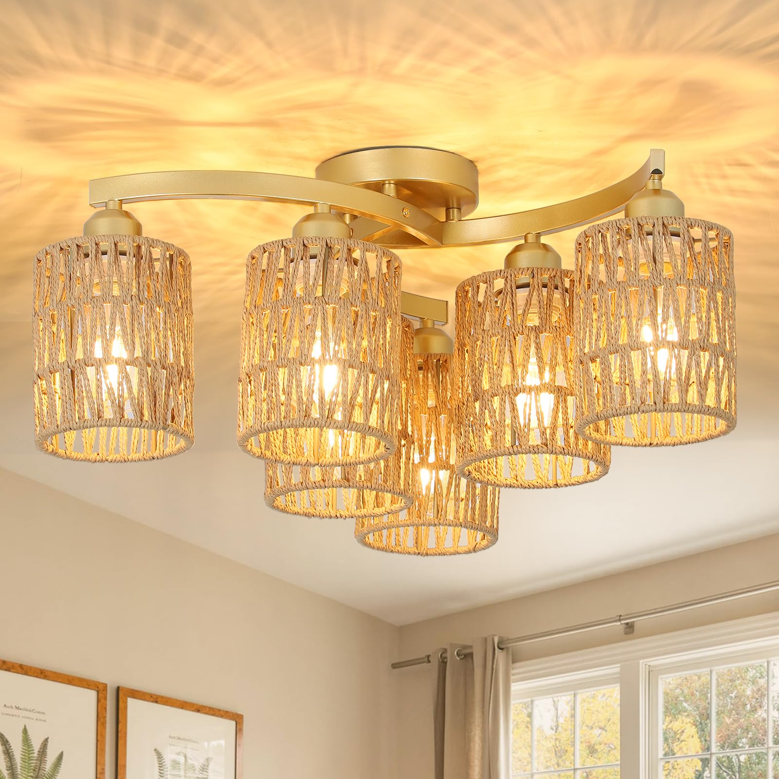 - 6 Lamp Gold Ceiling Light Fixtures - Bribyit semi flush mount ceiling light is made of hand-woven natural rattan and durable metal, which is more safety and healthy. 6 lamp head design is great for illuminating large spaces, making it an ideal living room lamp or dining room light fixtures; the hollow lampshade design casts 360°of light and shadow throughout your space, creating a warm and comfortable atmosphere.