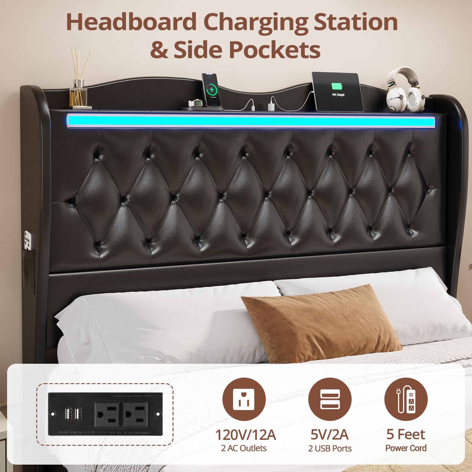 BTHFST Queen Size Bed Frame Tall Headboard with LED Lights & Charging Station, Upholstered Wing Headboard & Footboard, Heavy Duty Wooden Slats, No Box Spring Needed, Easy Assembly (Black, Queen)