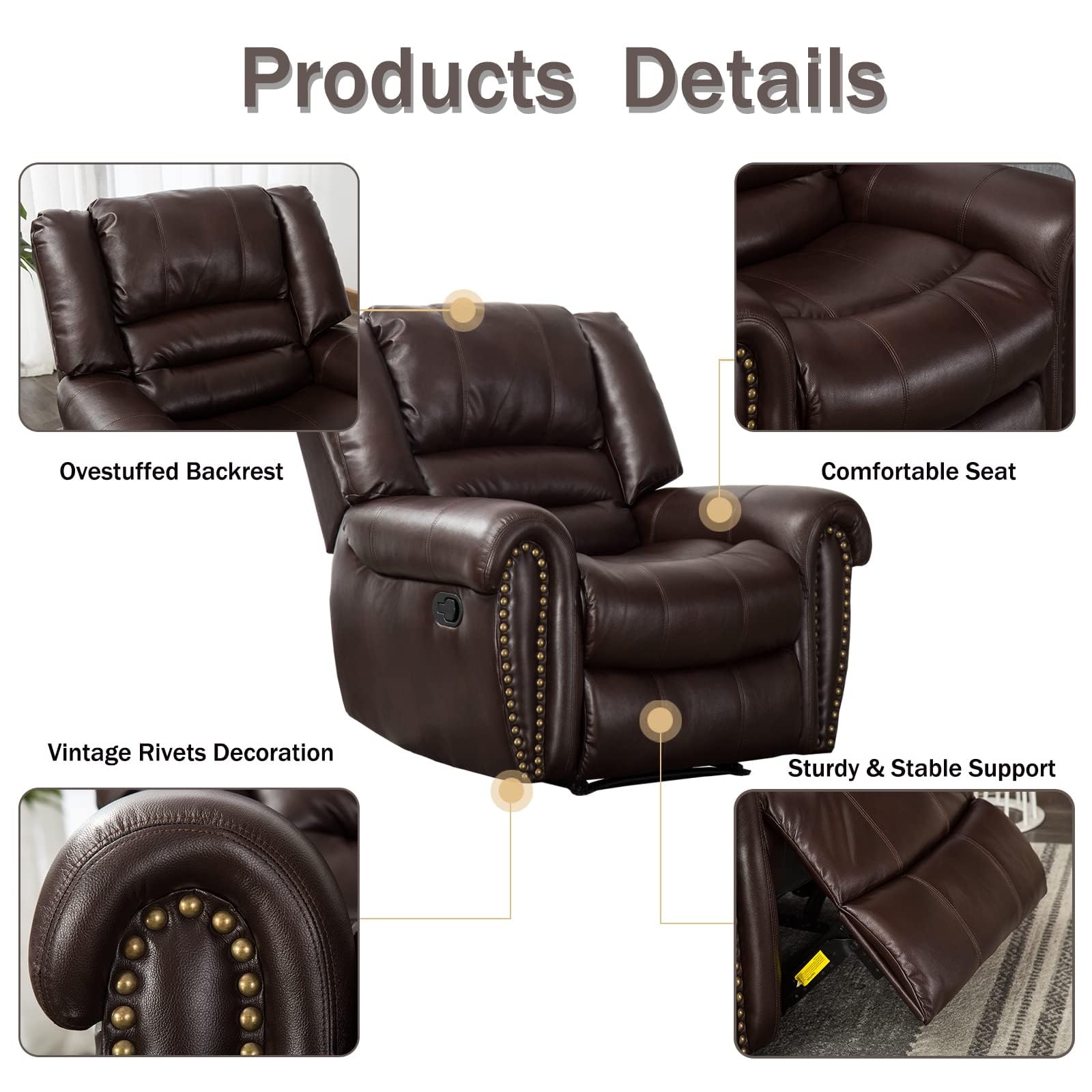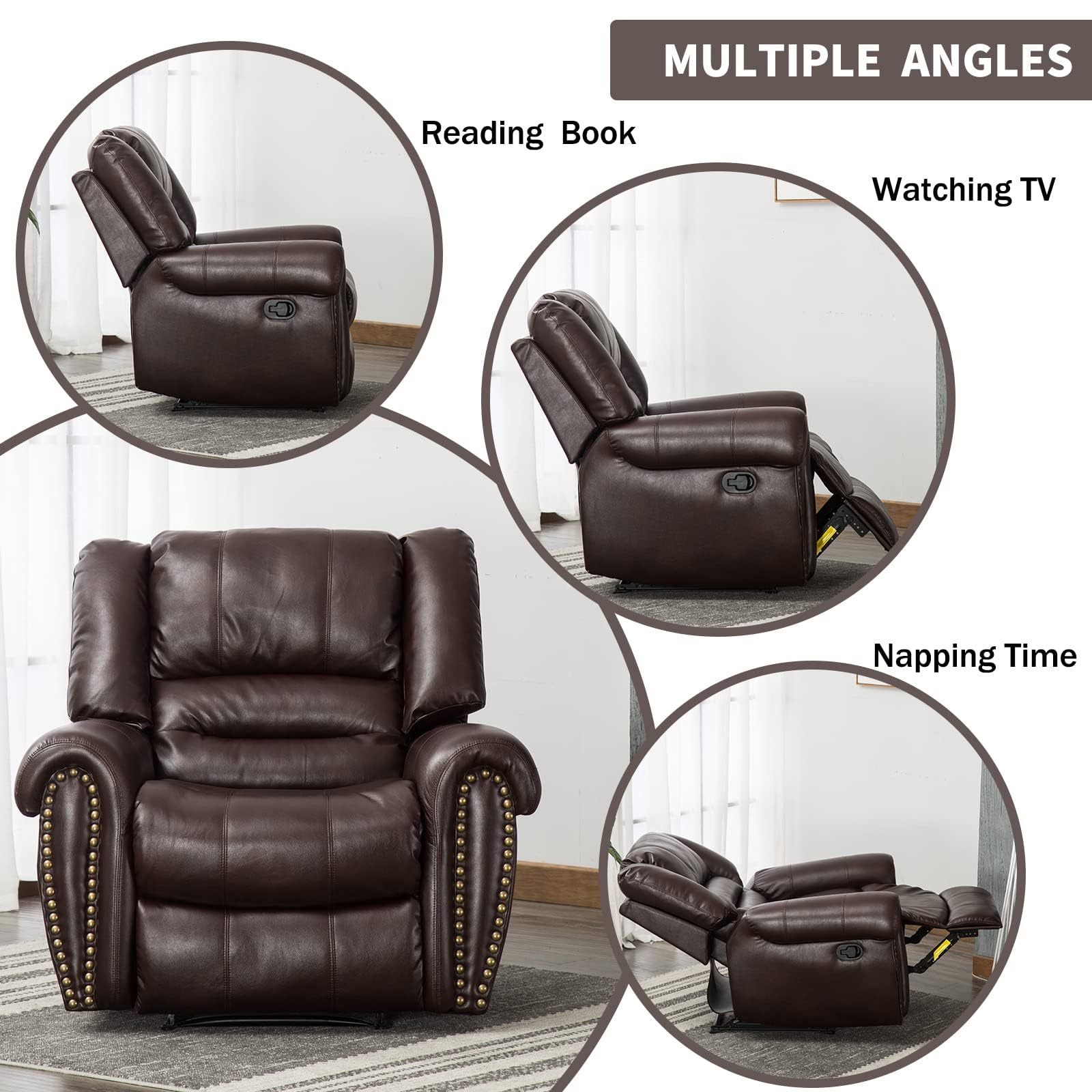 - Breathable Leather Recliner: As the use of high-quality faux leather for upholstery material, caring for the chair is quite easy. With high-density foam and laminated veneer lumber (LVL) system to provide maximum comfort and stability, suitable for living room, bedroom and home theater room, and brass nails set off a classic and luxurious style of decoration.
