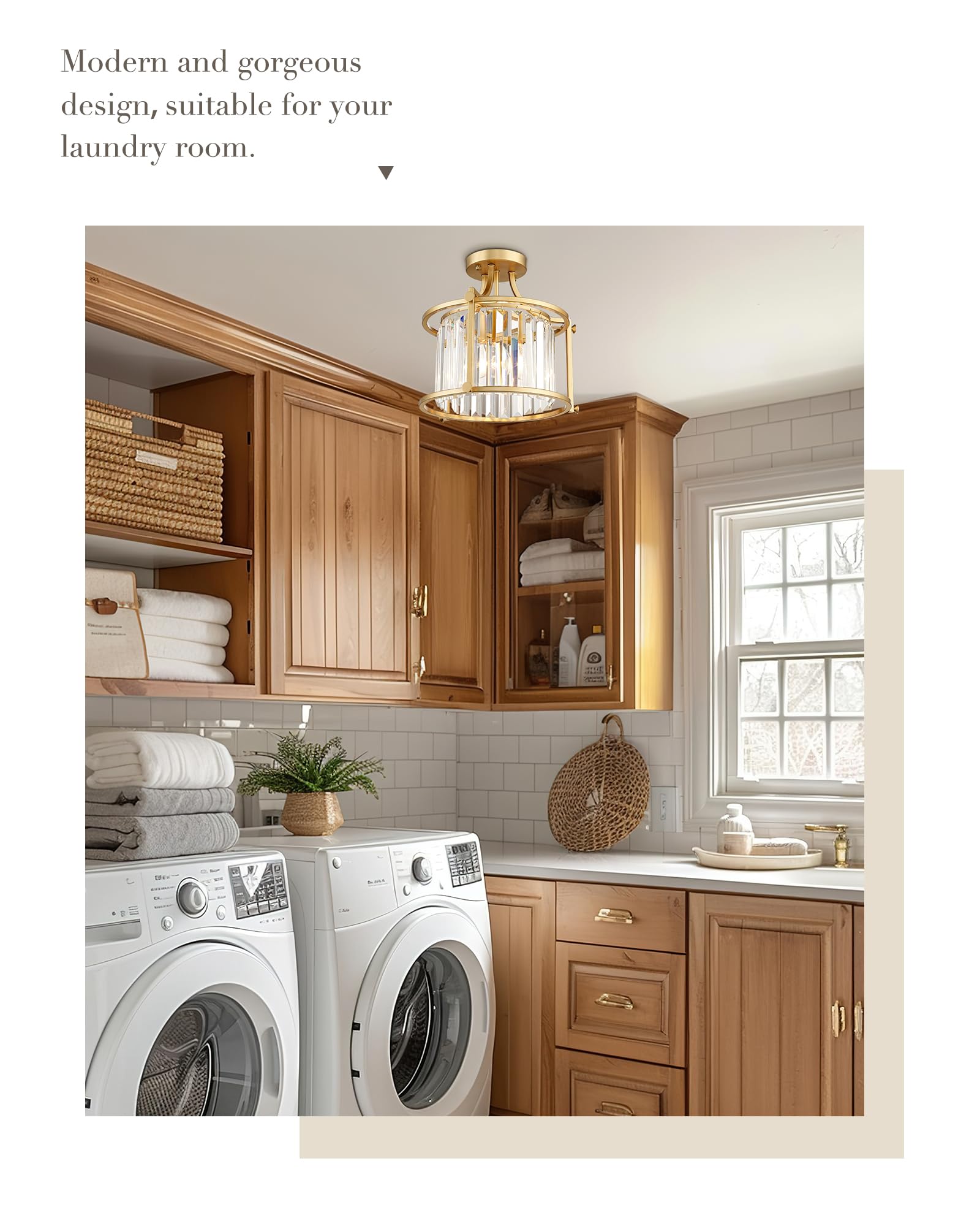 - MODERN AND STYLISH DESIGN: Use this ceiling chandelier in a room that need a touch of glam to enhance the look of any room. An open cylindrical frame in a warm gold finish encloses the clear crystals, give your home lighting an elegant upgrade with this light fixtures ceiling mount. The bedroom lights for ceiling provides you with lighting and warm romantic atmosphere.