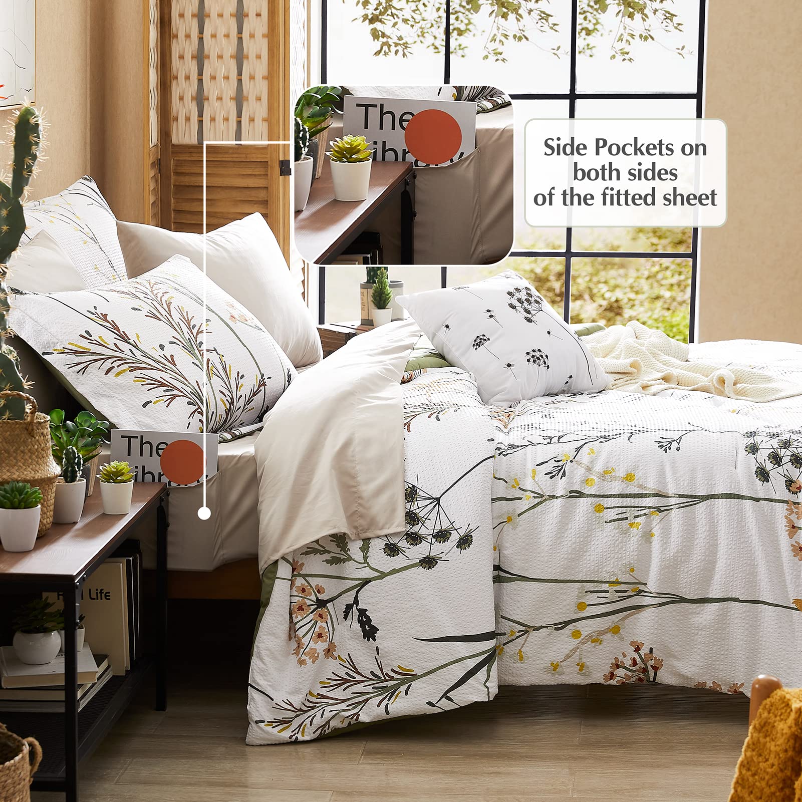 - Floral Farmhouse & Seersucker Design Create a cozy vibe for your bedroom with our green plant Queen comforter set, framed by branches and dandelion . The exquisite crafting techniques and the premium seersucker fabric are used to display the vivid farmhouse style, not only the lovely scenery you will enjoy, but also the soft texture of our comforter!