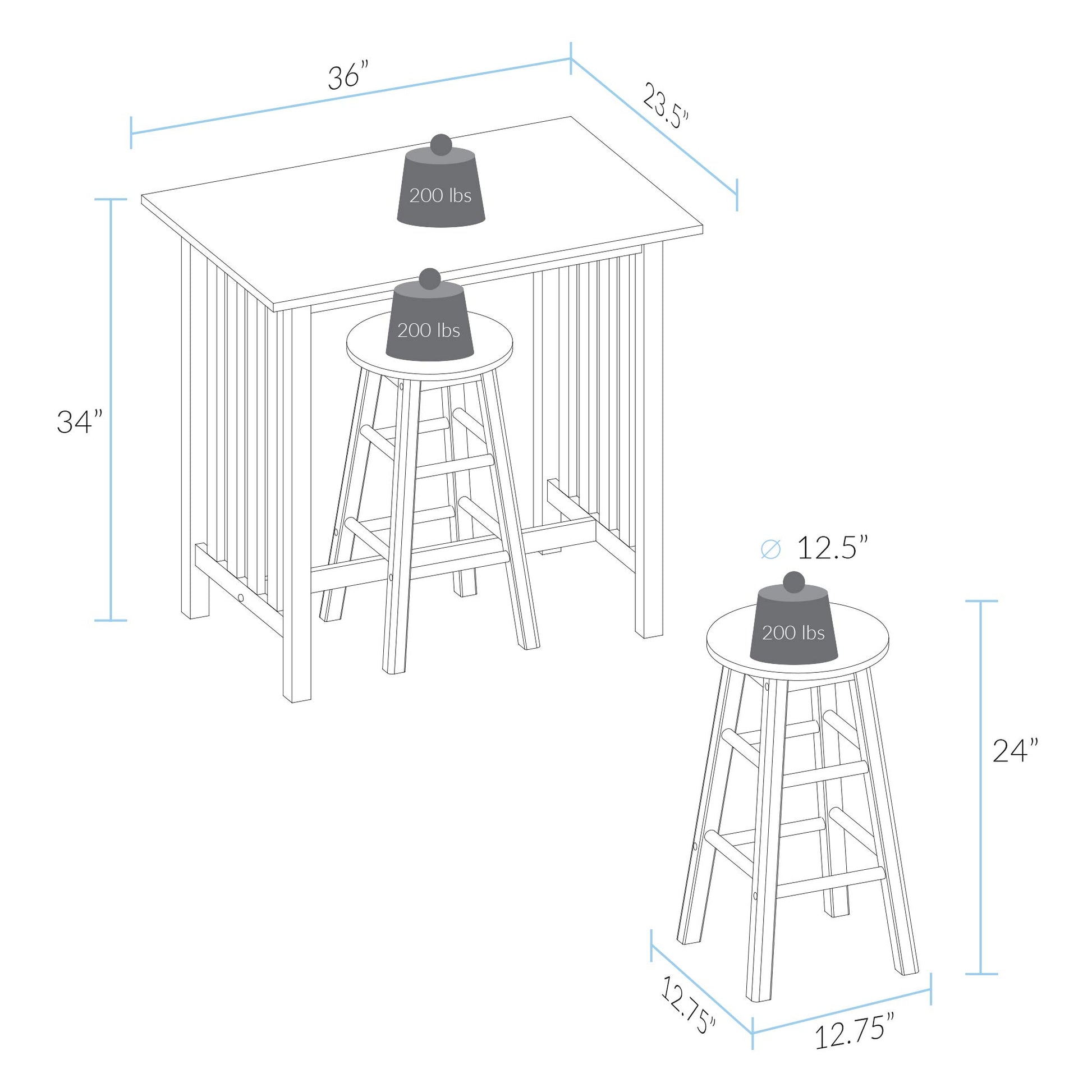 - Dimensions: Table: 34 inches high x 36 inches wide x 23.5 inches deep; Stool: 24 inches high x 12.75 inches wide x 12.75 inches deep; Weight: 50.3 pounds