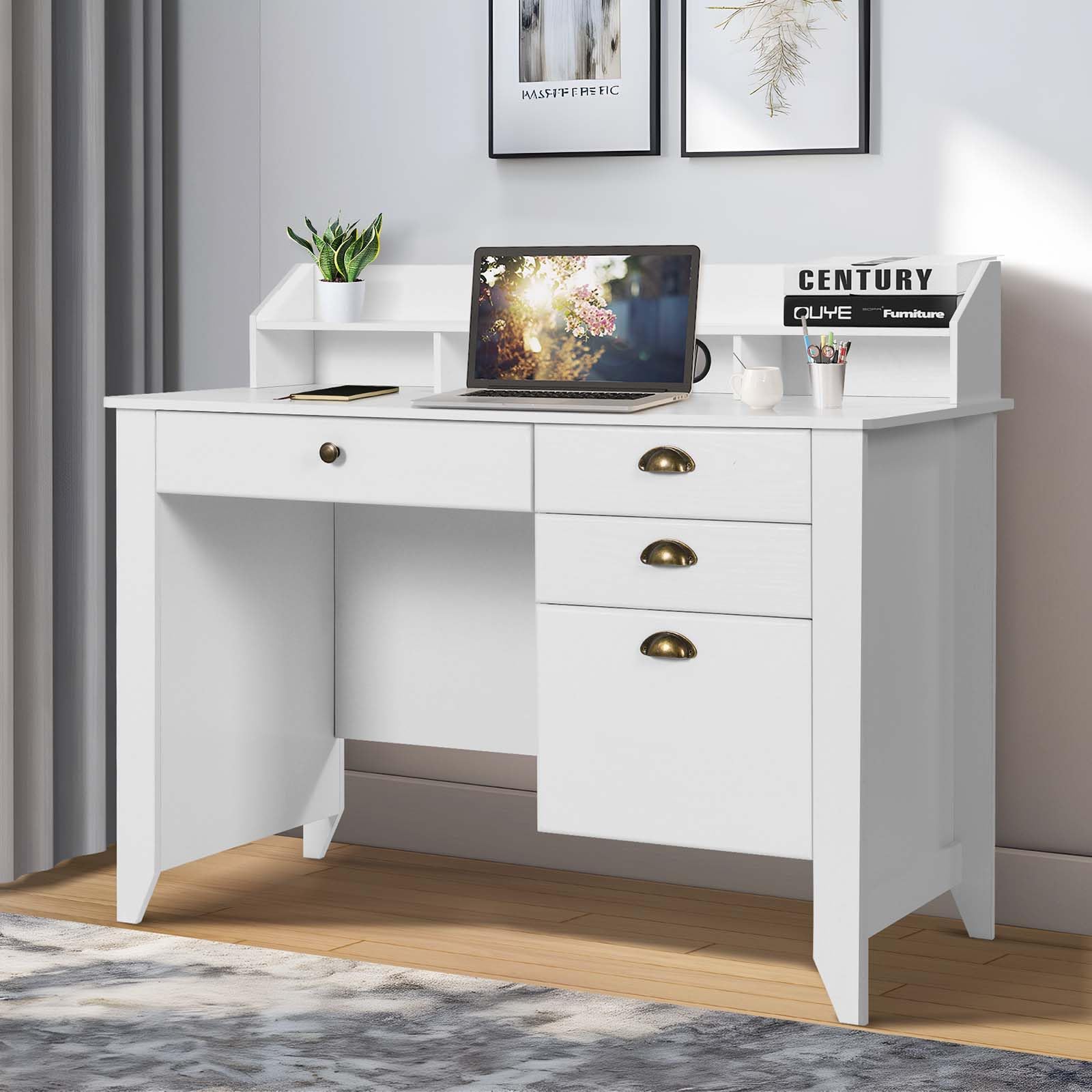 - Enrich Your Work Space: 47.5" x 22" tabletop of the white desk with drawers provides plenty of space for your daily work. 3 drawers and 1 file drawer provide more storage space for your home office supplies . This desk for bedroom futures top monitor stand is designed for correcting the sitting position