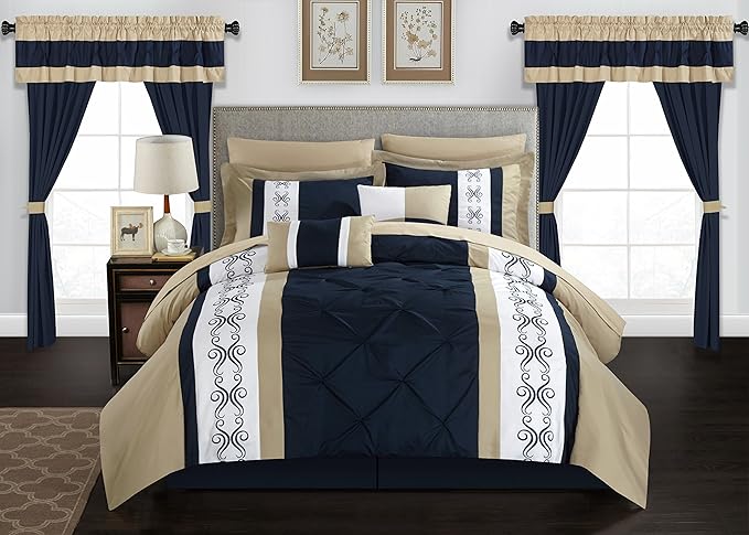 - COMPLETE BEDDING ENSEMBLE: Enjoy the luxurious 104"x90" king bedroom set comforter, crafted for sumptuous comfort and style. Shams, decorative pillow, flat & fitted sheets, bed Skirt, pillowcases, curtain panels & tiebacks, and valances enhances comfort and texture, completing your captivating bedroom ensemble.