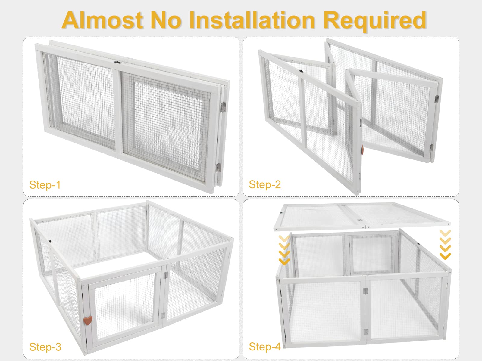- No assembly required-a beginner could open or fold up within 1 minute. The top section and right door with safety buckle can be opened, convenient for pet access, feeding, cleaning and other tasks.