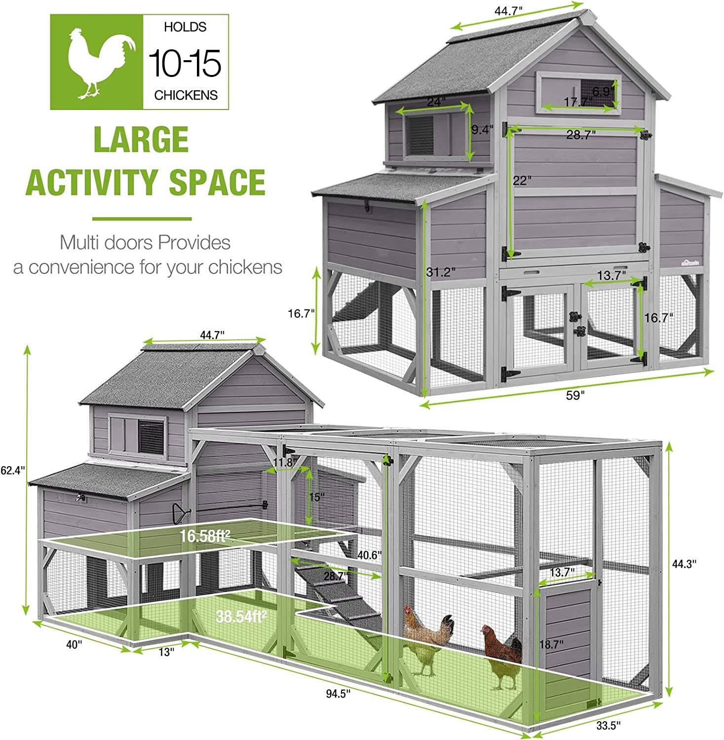 - Super large running area with 3 standing perches provide larger 27.75 ft² ground activity space. Chicken Capacity:10-15Chickens.