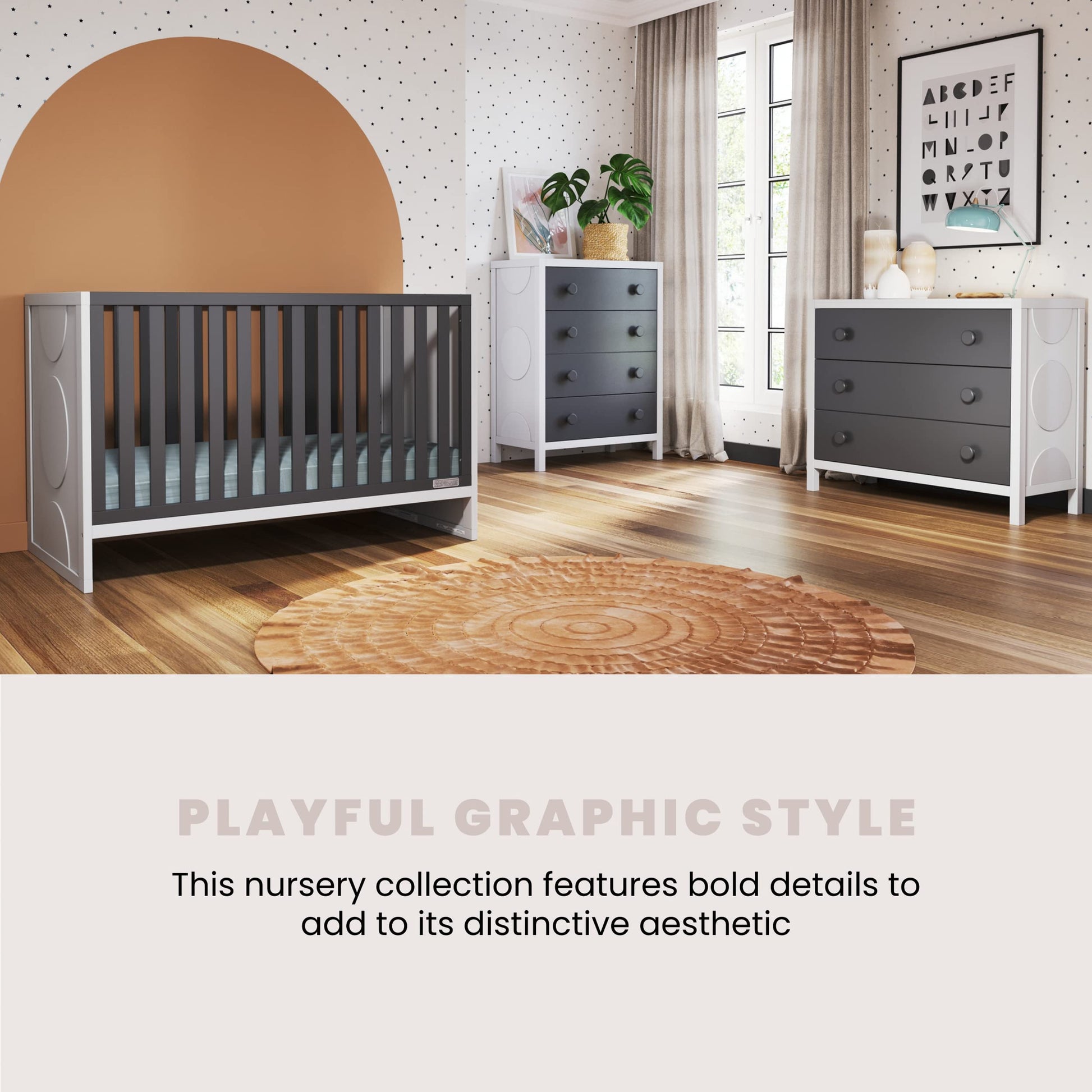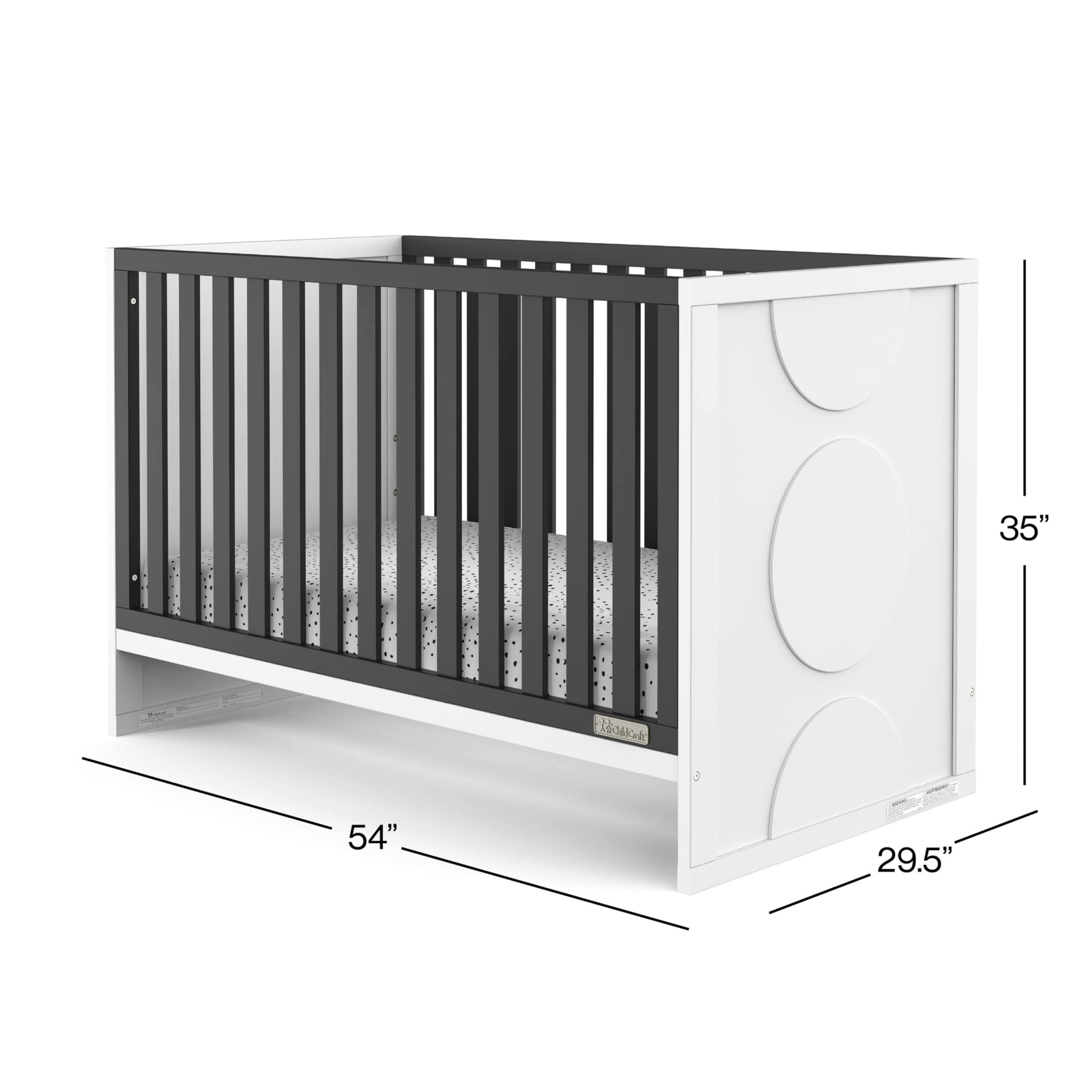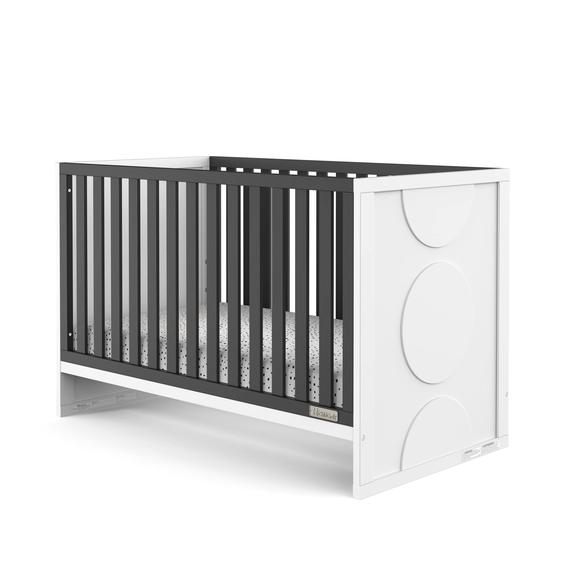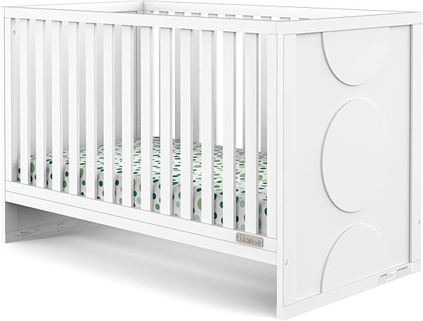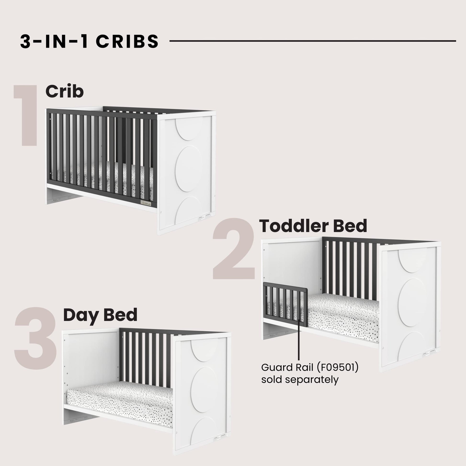 - Unique and bold contemporary circle patterned sides along with minimalist elements create a clean design for this 3-in-1 traditional euro-style crib in your baby’s room