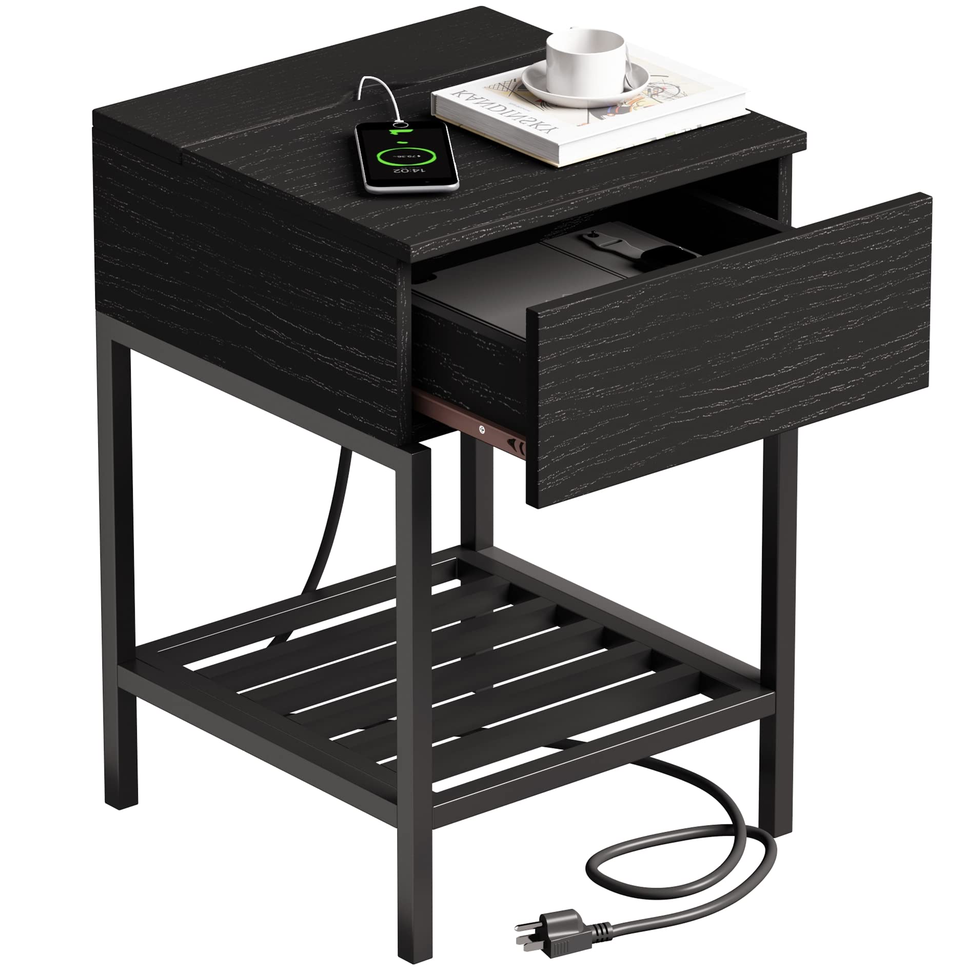 - end table with power outlet side table sofa table nightstand beside table with charging station flip top table with storage drawer 2-tier shelf for living room bedroom home small space Walnut Grey Rustic Brown