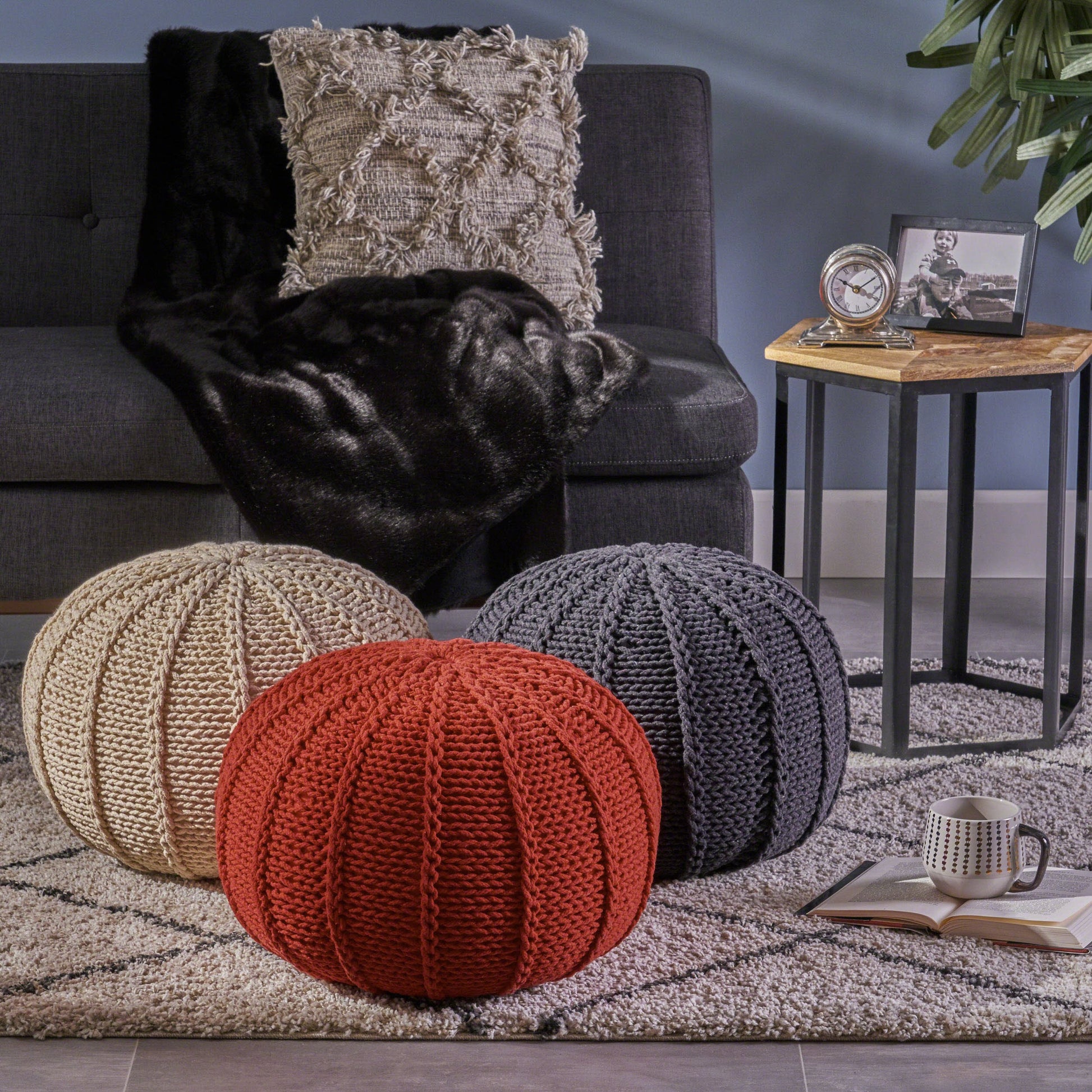 - Enjoy this cotton knitted round Pouf in any room of your home. Perfect for putting your feet up or using it as a small extra Seat when company is over. Easy to store in a corner or by the bed when not in use, This pouf not only looks cute but is functional too.