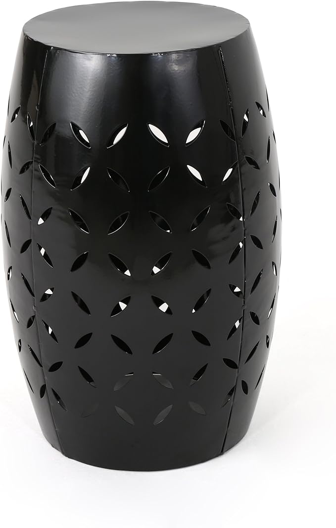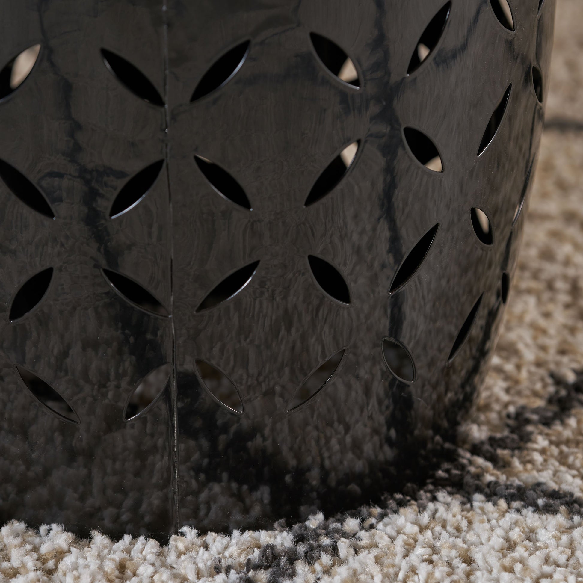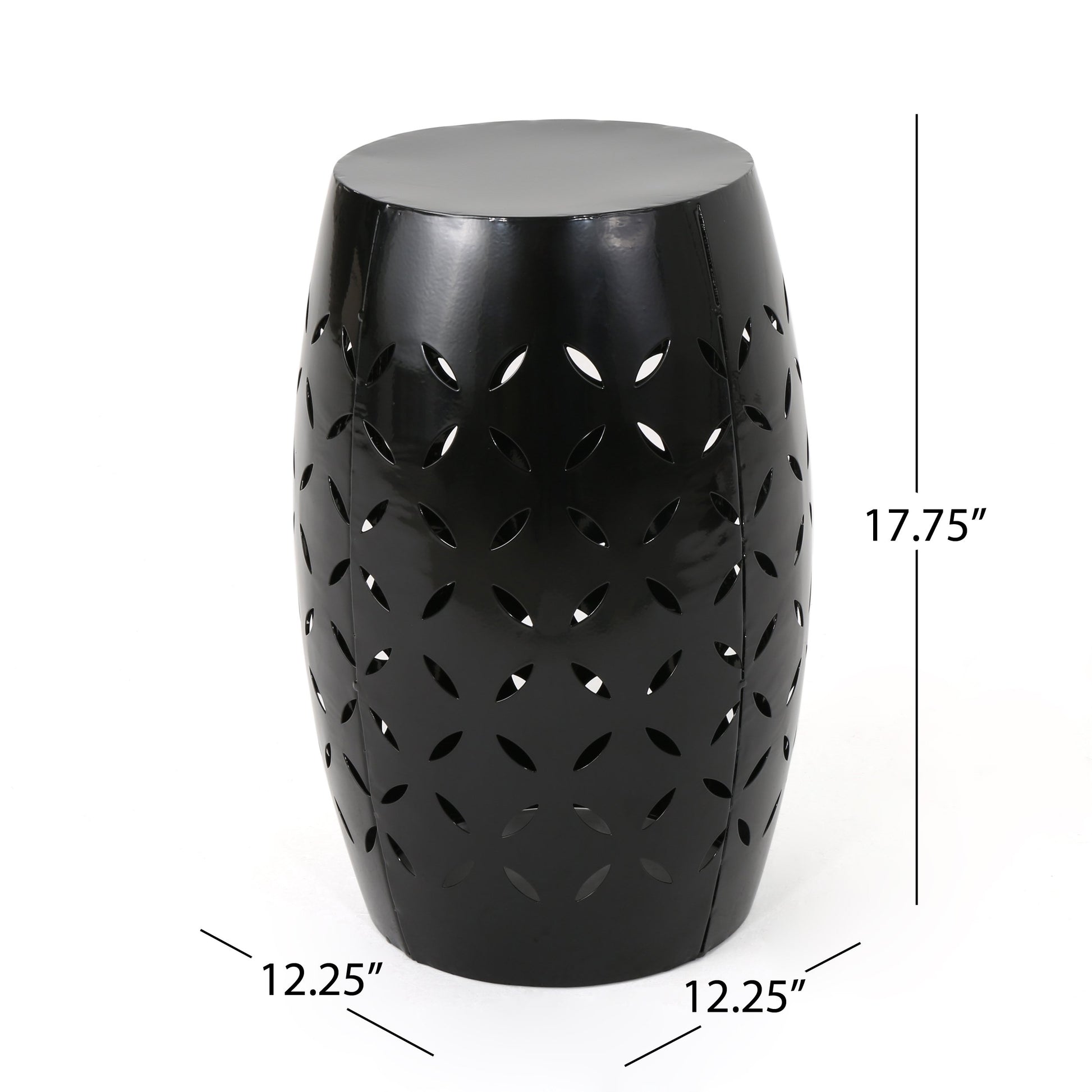 - Featuring a unique and stable Barrel shape, his beautiful lace-cut side table is a unique element for any room in your home, Its all-metal construction will hold up to the weather and age very nicely, ideal when combined with a chair to create a cozy corner, This might also be used as a place to display some special item
