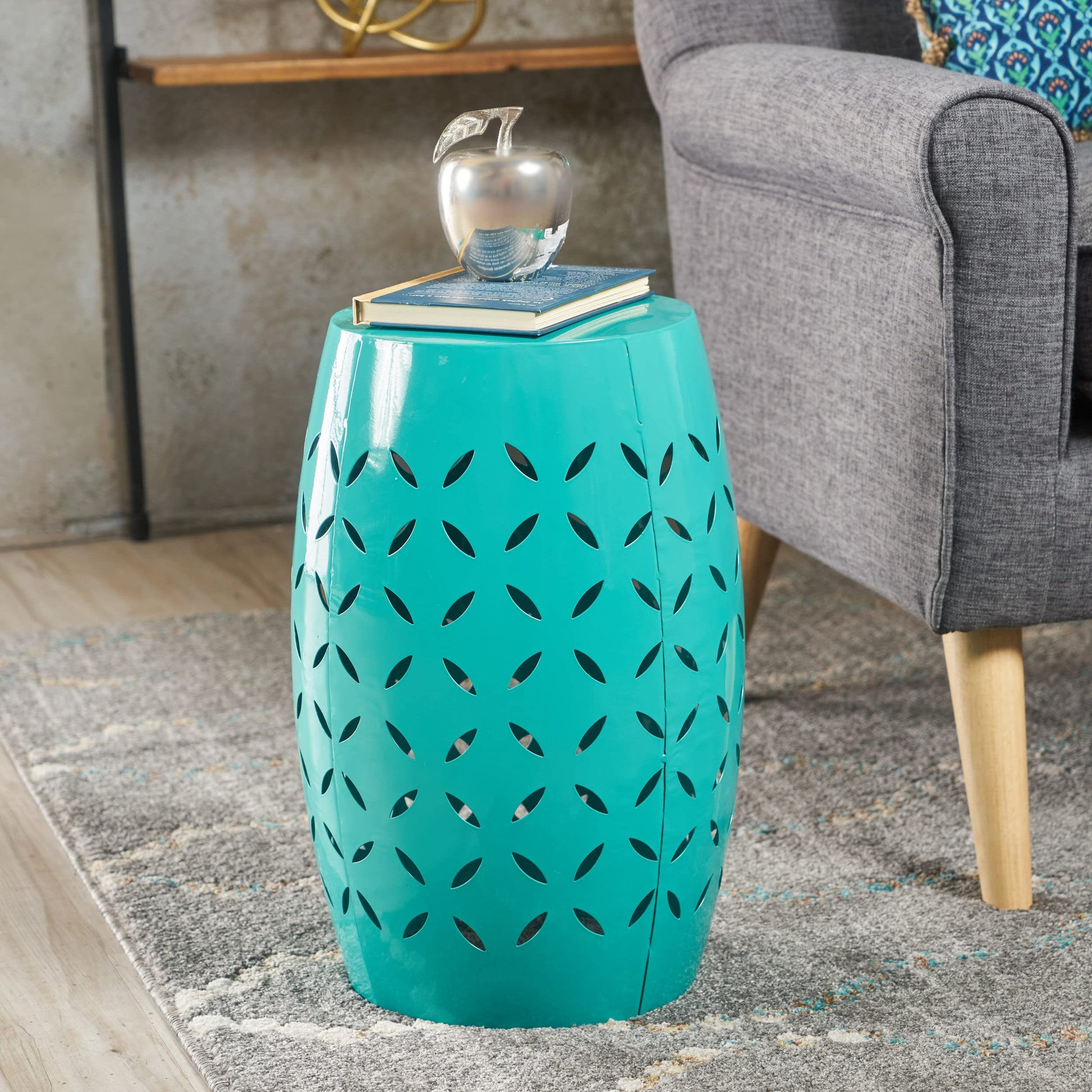 - Featuring a unique and stable barrel shape, his beautiful lace-cut side Table is a unique element for any room in your home. Its all-metal construction will hold up to the weather and age very nicely. Ideal when combined with a chair to create a cozy corner, This might also be used as a place to display some special item
