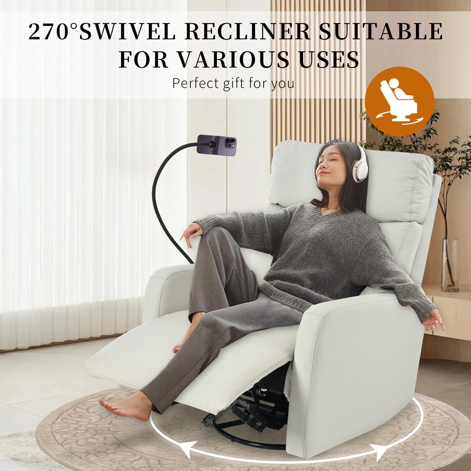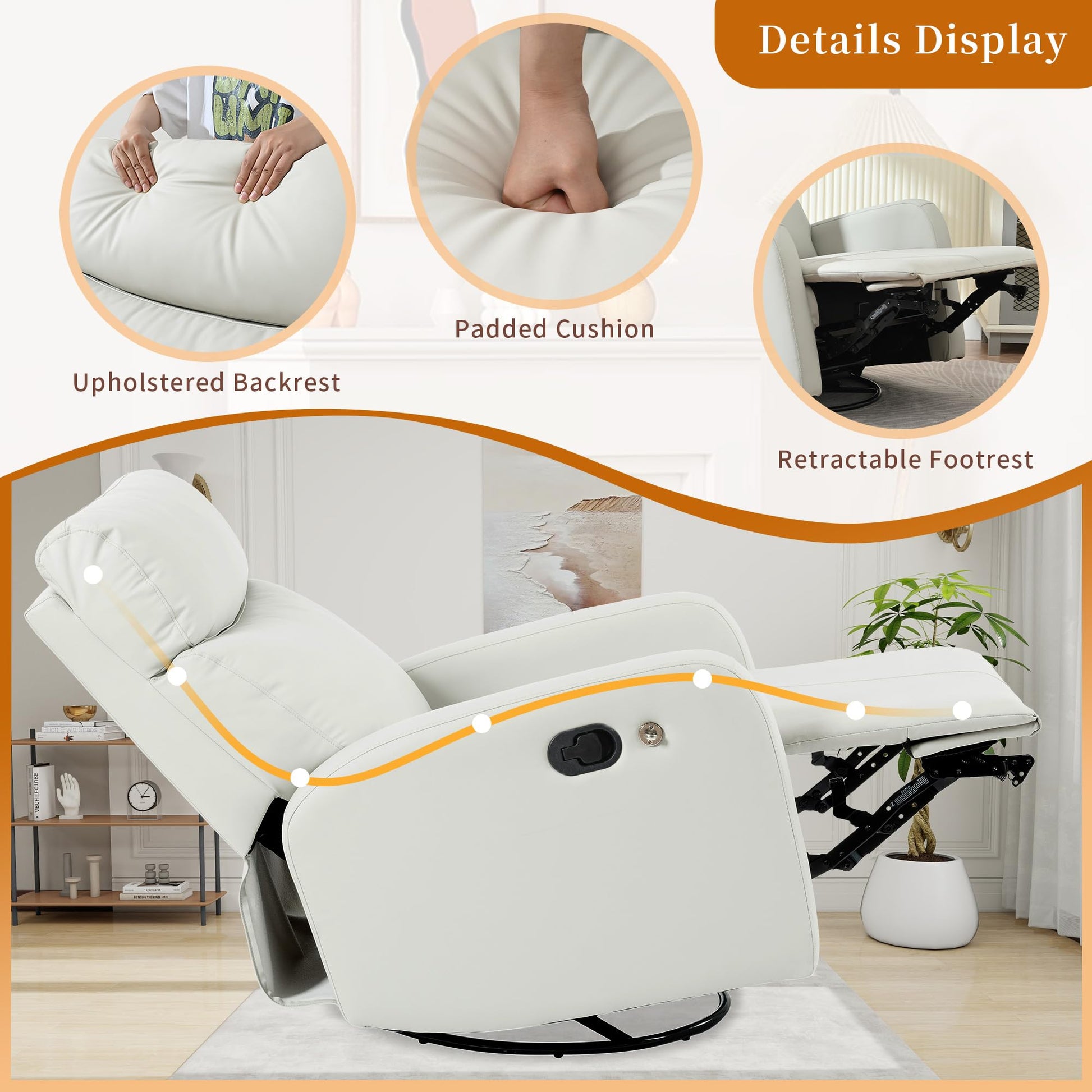 - Durable and easy to clean: This Swivel Faux Leather Recliner Chair is breathable, has no weird smell, and is easy to clean up. This Manual Rocking Recliner Chair has a strong metal frame that can hold up to 300 pounds. It's made to give you lasting comfort and support