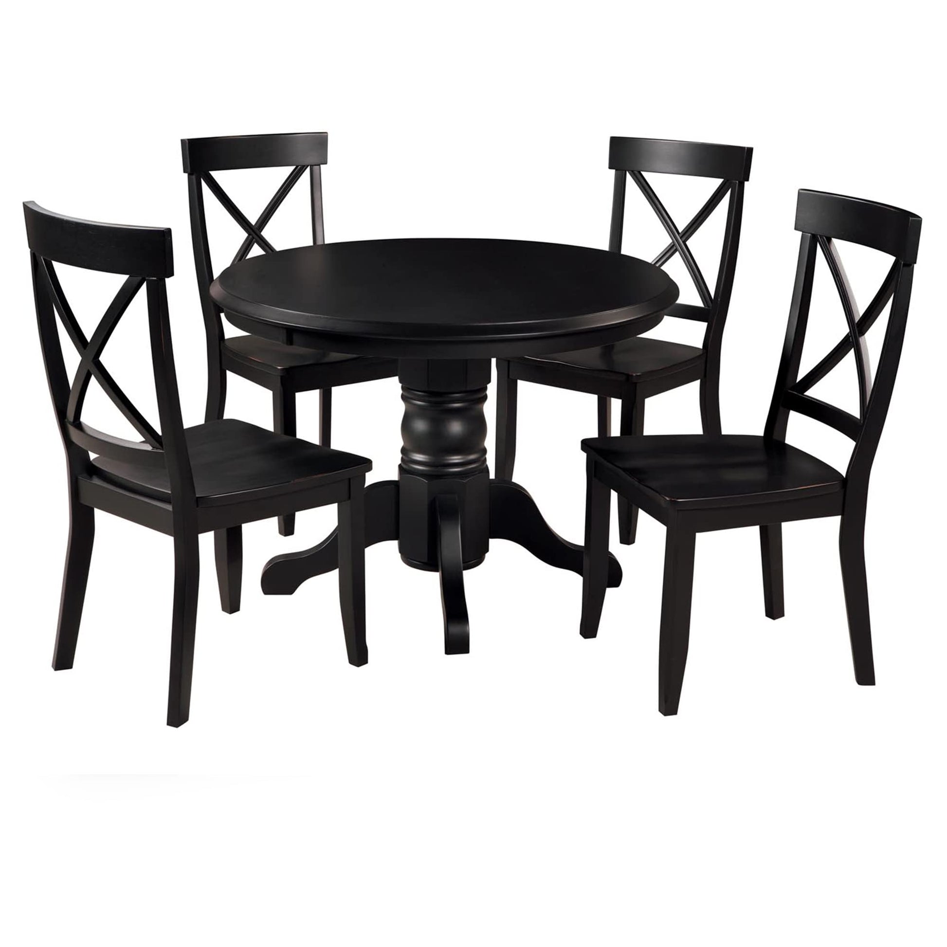 - 5-piece dining set includes a round pedestal dining table and four side chairs