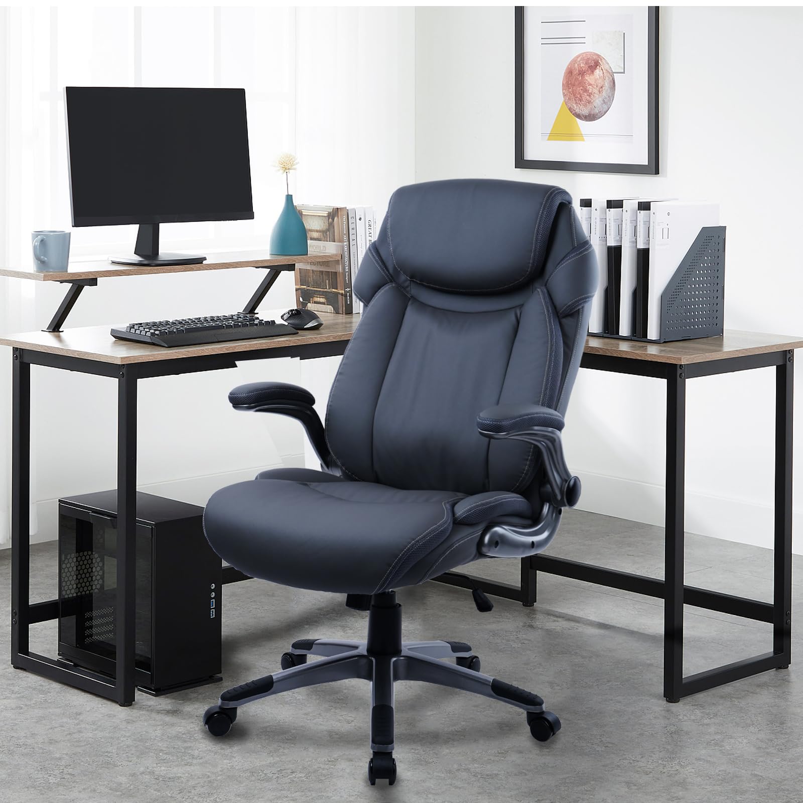 - FULLY ADJUSTABLE - The swivle and flip up arms of the office chair allows you to maximize the use of your workspace without strain. This modern office chair features with tilt function and adjustable seat, you could rock the office chair high back or adjust the seat height to get your desired posture. An excellent home desk chair accommodates for all workplaces like home, office, desk and so on.