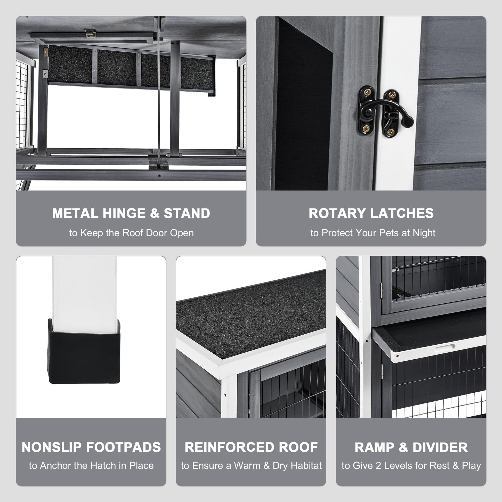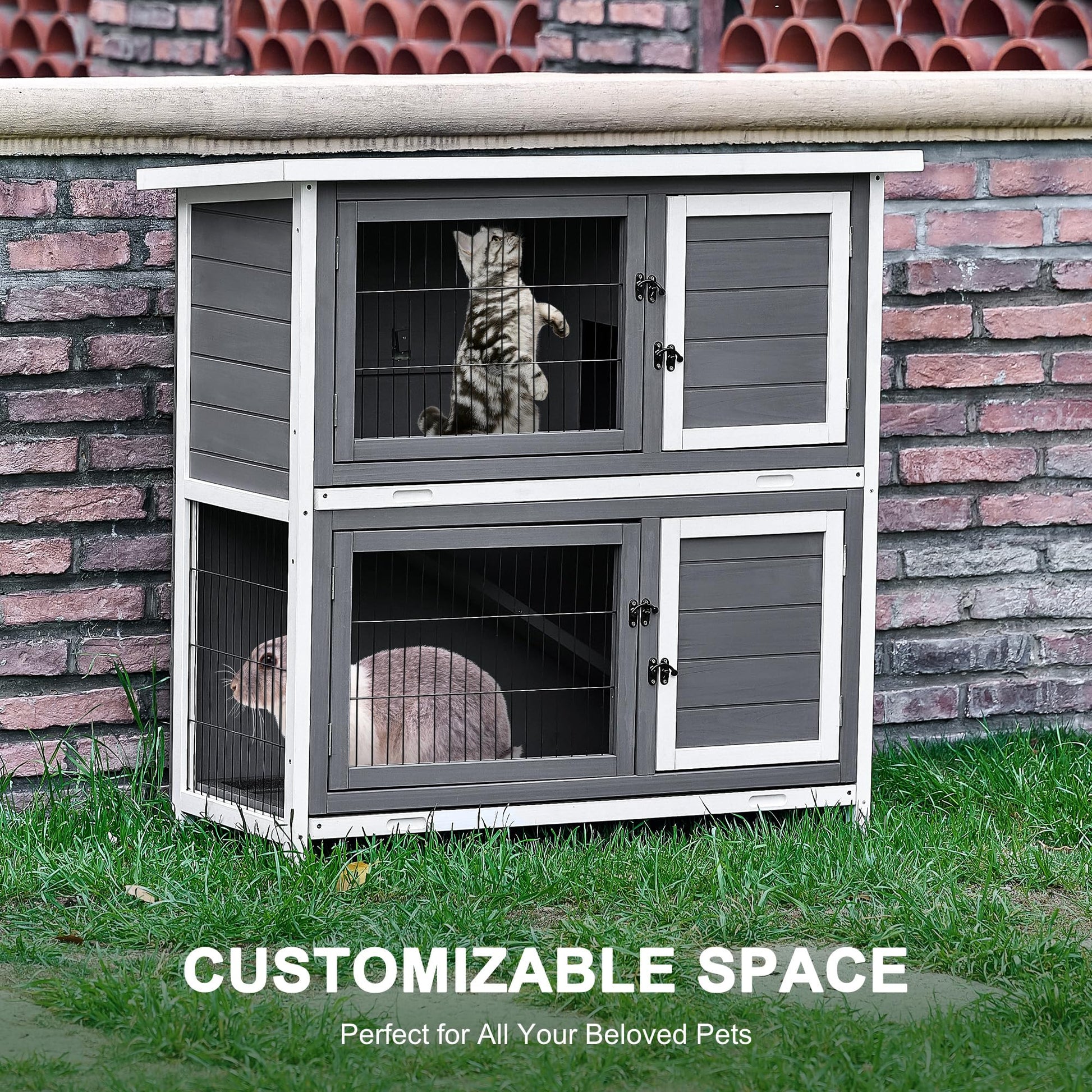 - With both private and open spaces, this pet enclosure is perfect for rabbits, guinea pigs, chickens, quails, and other small animals; the nonslip ramp lets your rabbits hop from one level to the next, while the hatch door separates the levels as needed