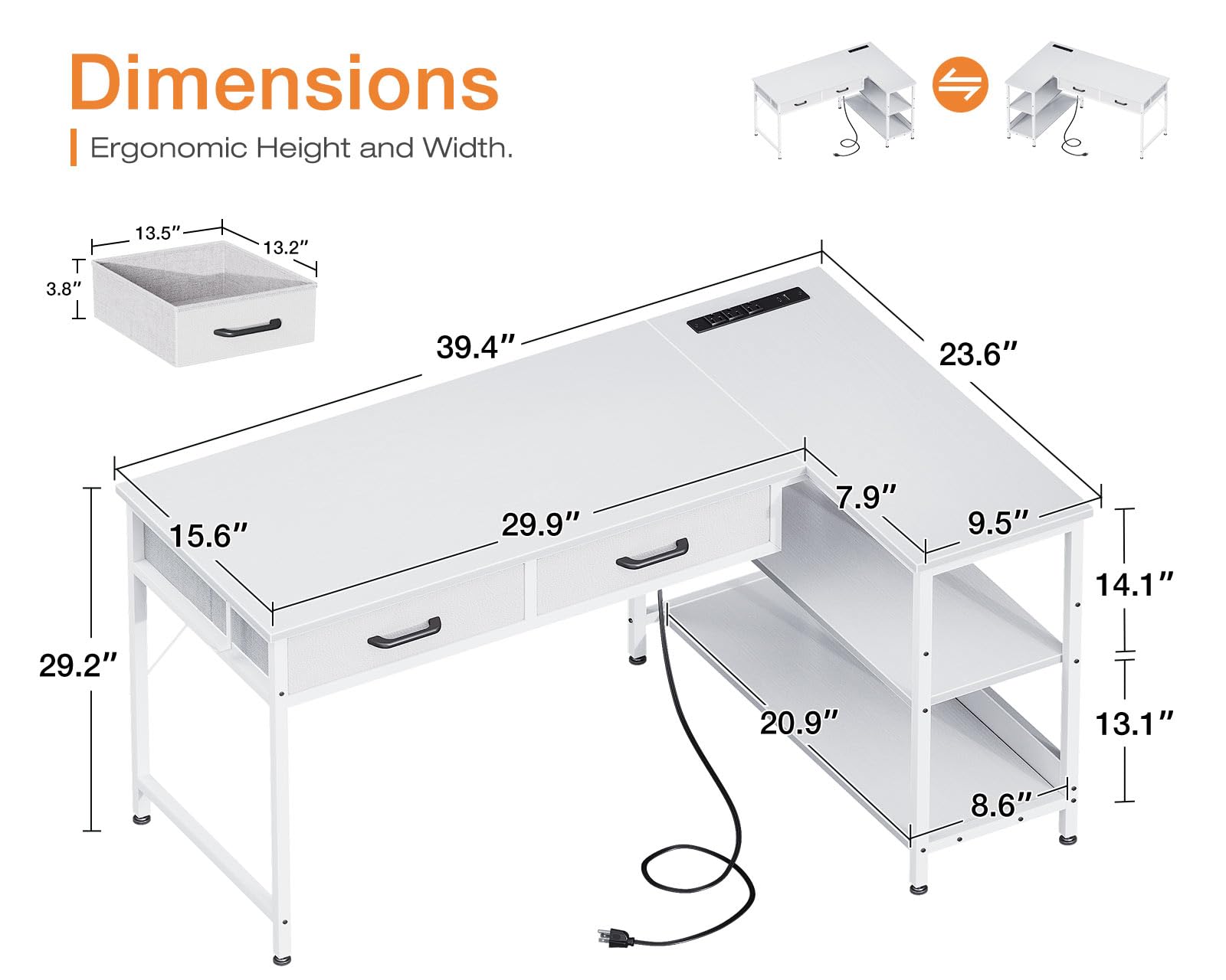 - This l desk is designed with storage features 2 durable fabric drawers and a double-tier storage shelves. The drawers can store items easily, making them perfect for organizing your documents, office or school supplies, gaming equipment, etc. The storage shelves can serve as a two-tiered bookshelf or organizer. This combination provides ample storage for everything you need during your work or study day.