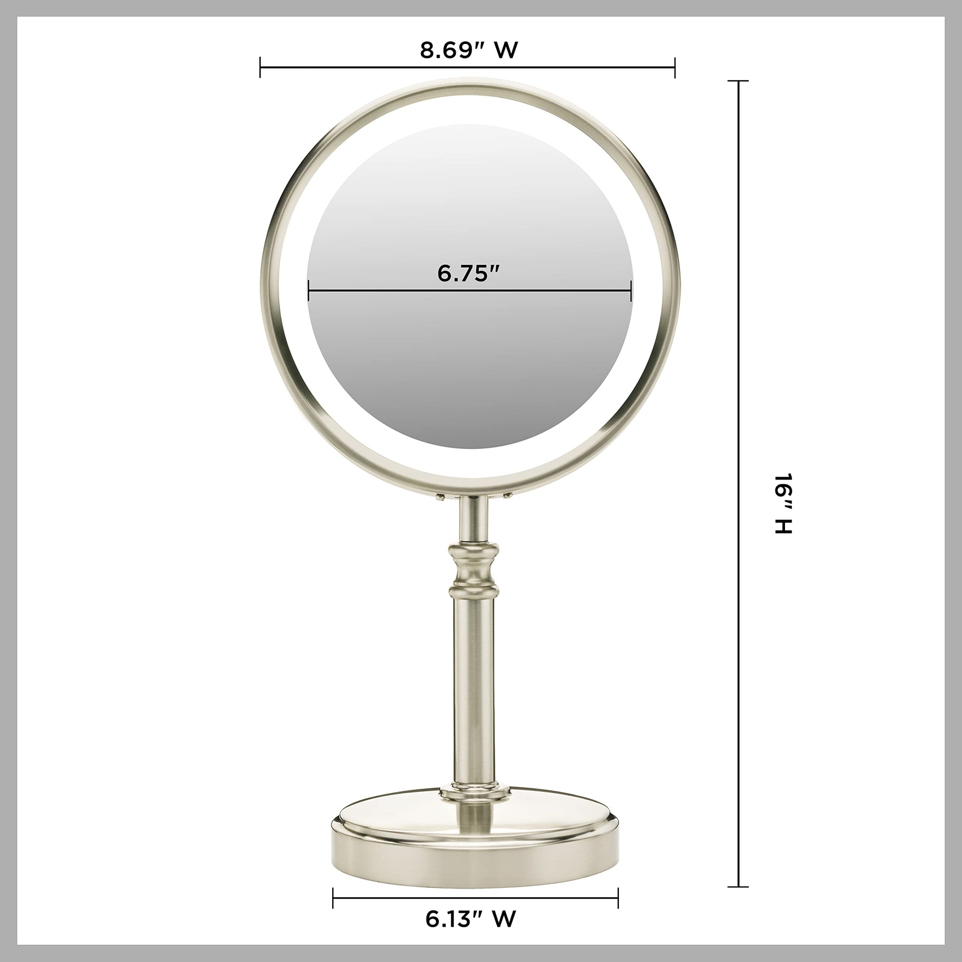 - Stylish Surroundings: This 8.5" diameter round mirror features a stylish satin nickel finish that compliments any decor. The On/Off switch is conveniently located on the 5ft line cord. Reflection will be distorted/inverted if not within 6" of the mirror