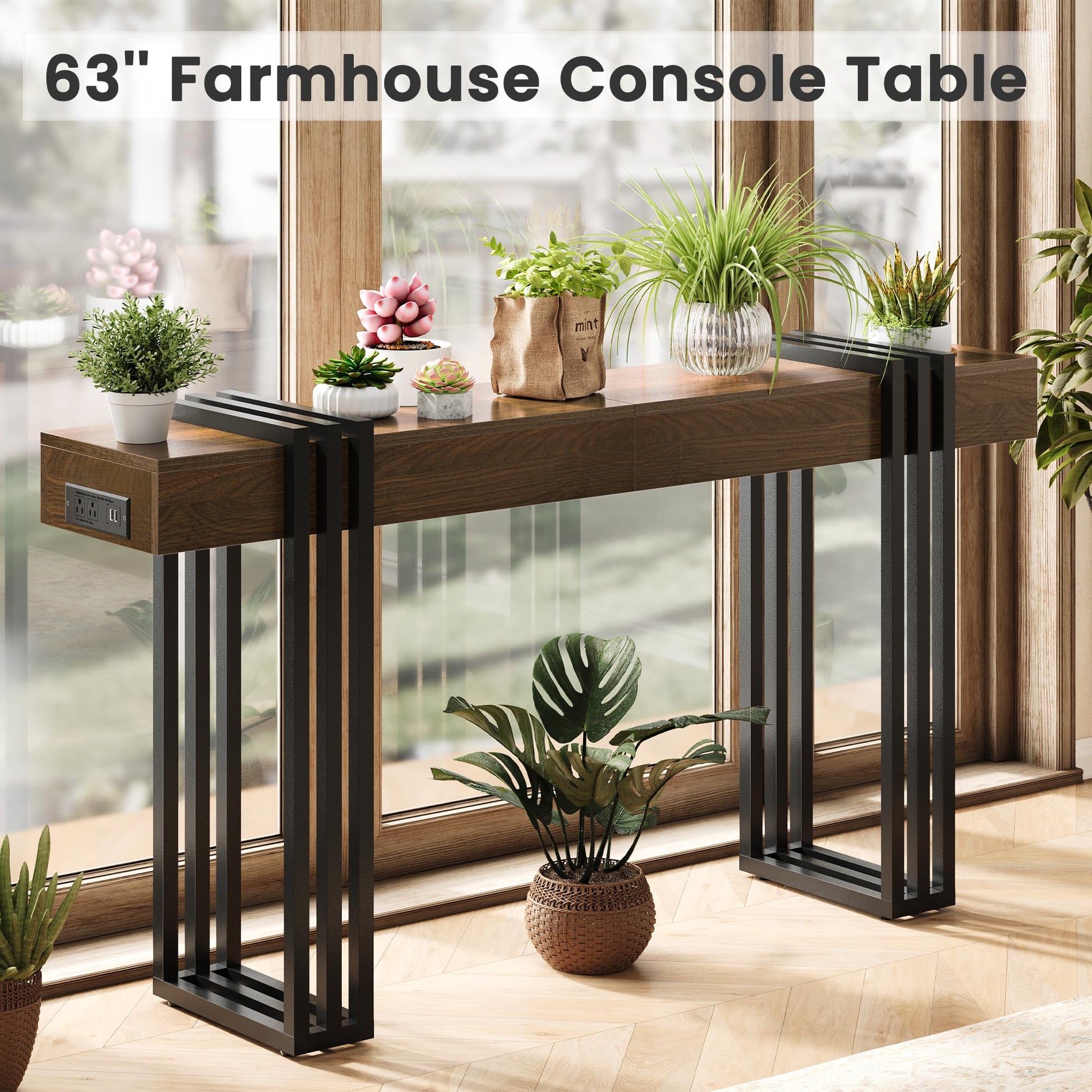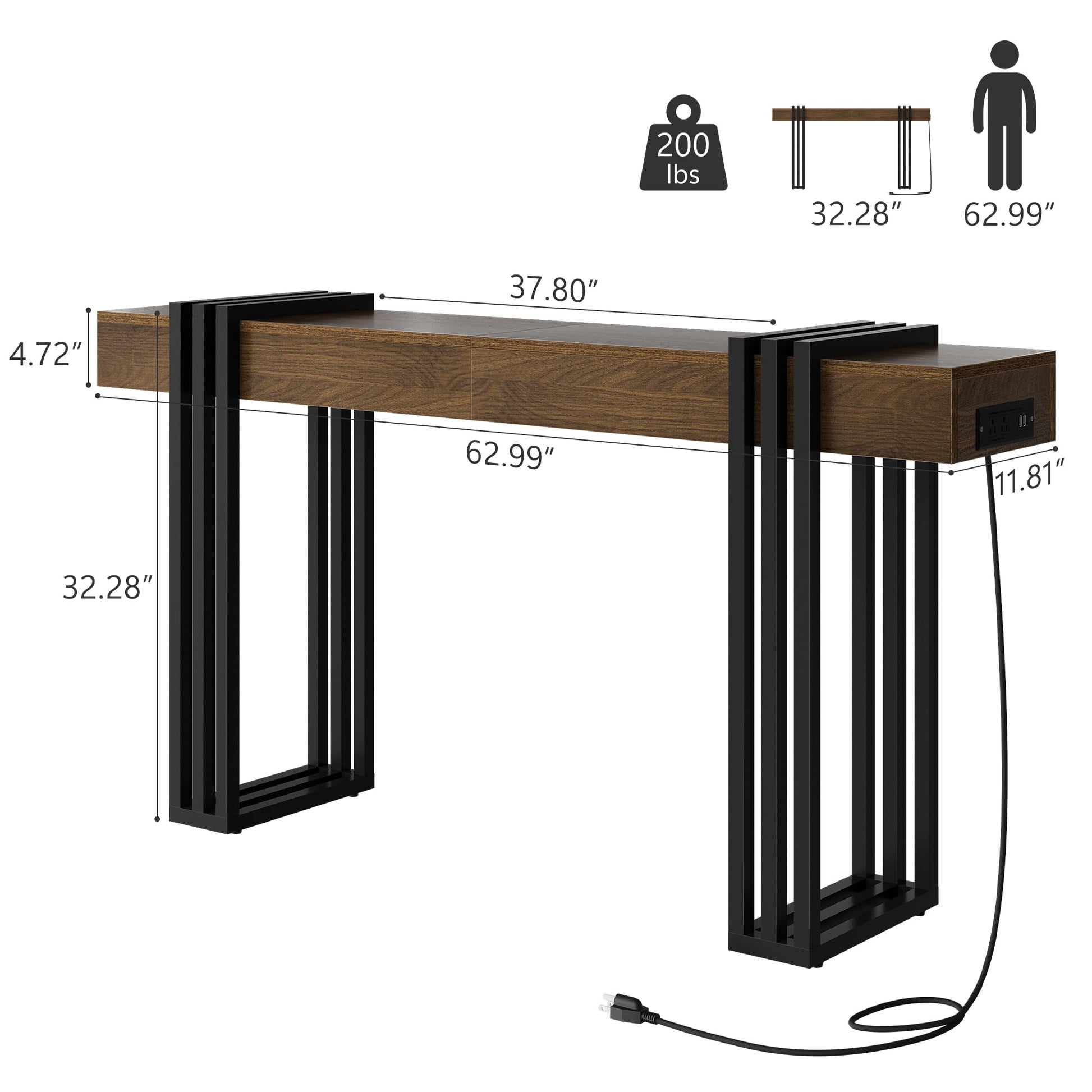 63" Console Table with Power Outlet - Walnut Wood Entryway Table