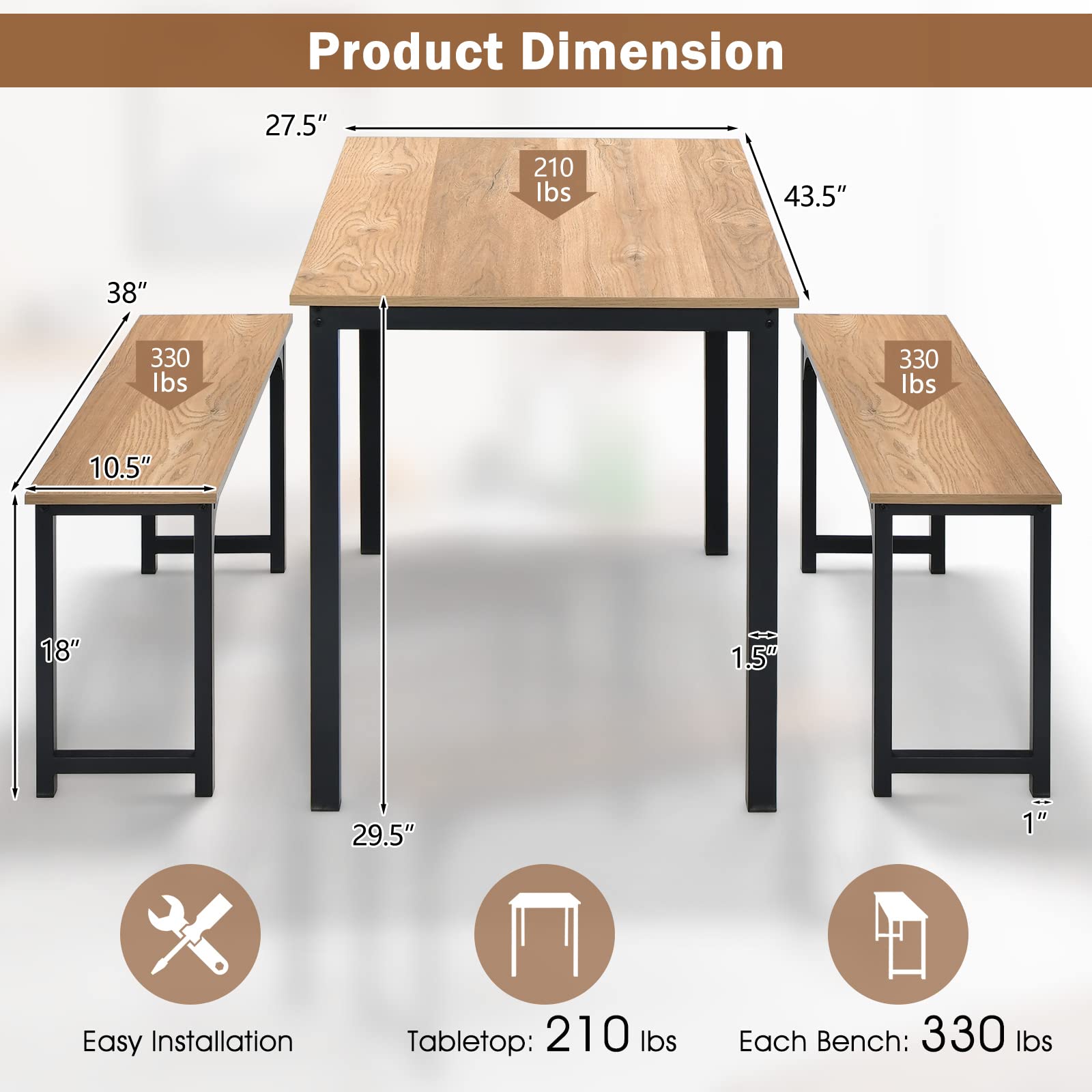 Complete 3-Piece Set – Includes 1 rectangular table and 2 benches in a matching finish for a cohesive design.