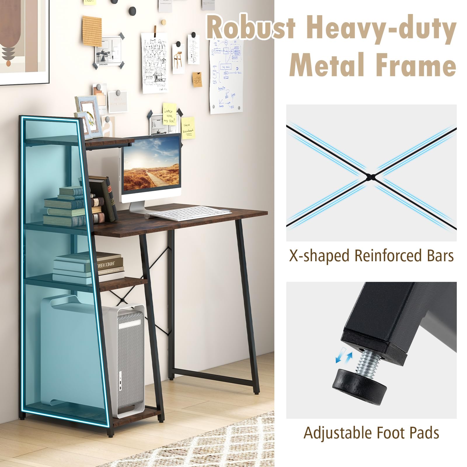 - [Sturdy Metal Construction:]Crafted from thick engineered wood board and sturdy steel frame, this computer desk is characterized by strong bearing capacity and high stability. Moreover, there are 4 adjustable foot pads and reinforced X-shape brackets, making it very stable without any wobbliness.