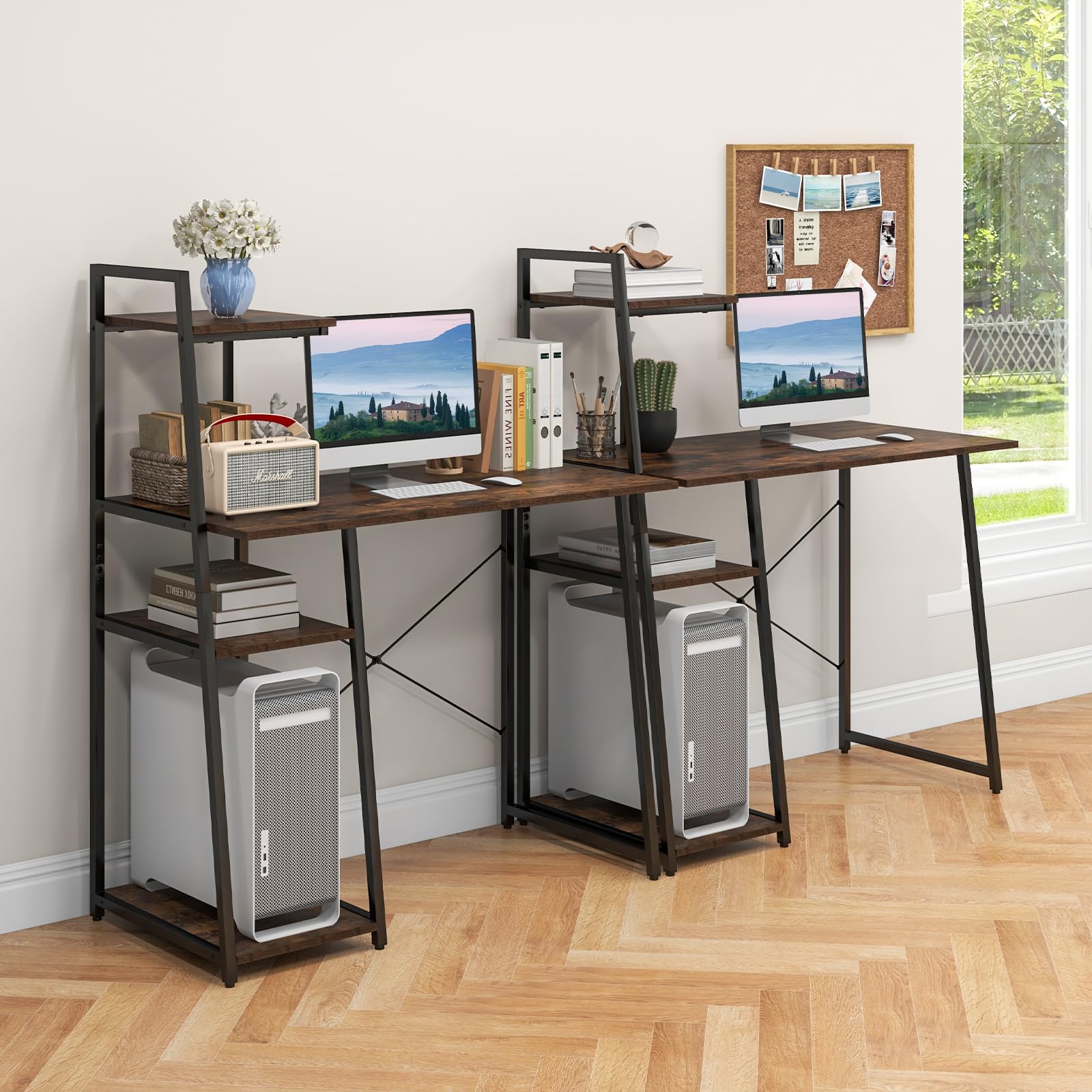 - [Open Storage Shelves:]This writing desk is equipped with 4-tier open shelves, which help to store and organize your books, folders and other items without taking up desktop space. And you can also use them as display shelves to place plants, clocks, photos and notepads. In addition, the lower shelf can be removed to place your CPU.