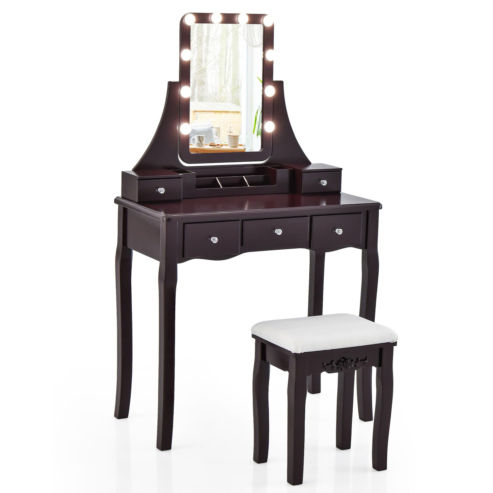 Vanity Desk with Lights, Makeup Table with 3 Modes Adjustable Lighted LED Mirror & Cushioned Stool, Dressing Table Set with 3 Drawers for Women Girls Bedroom Dressing Room, Brown