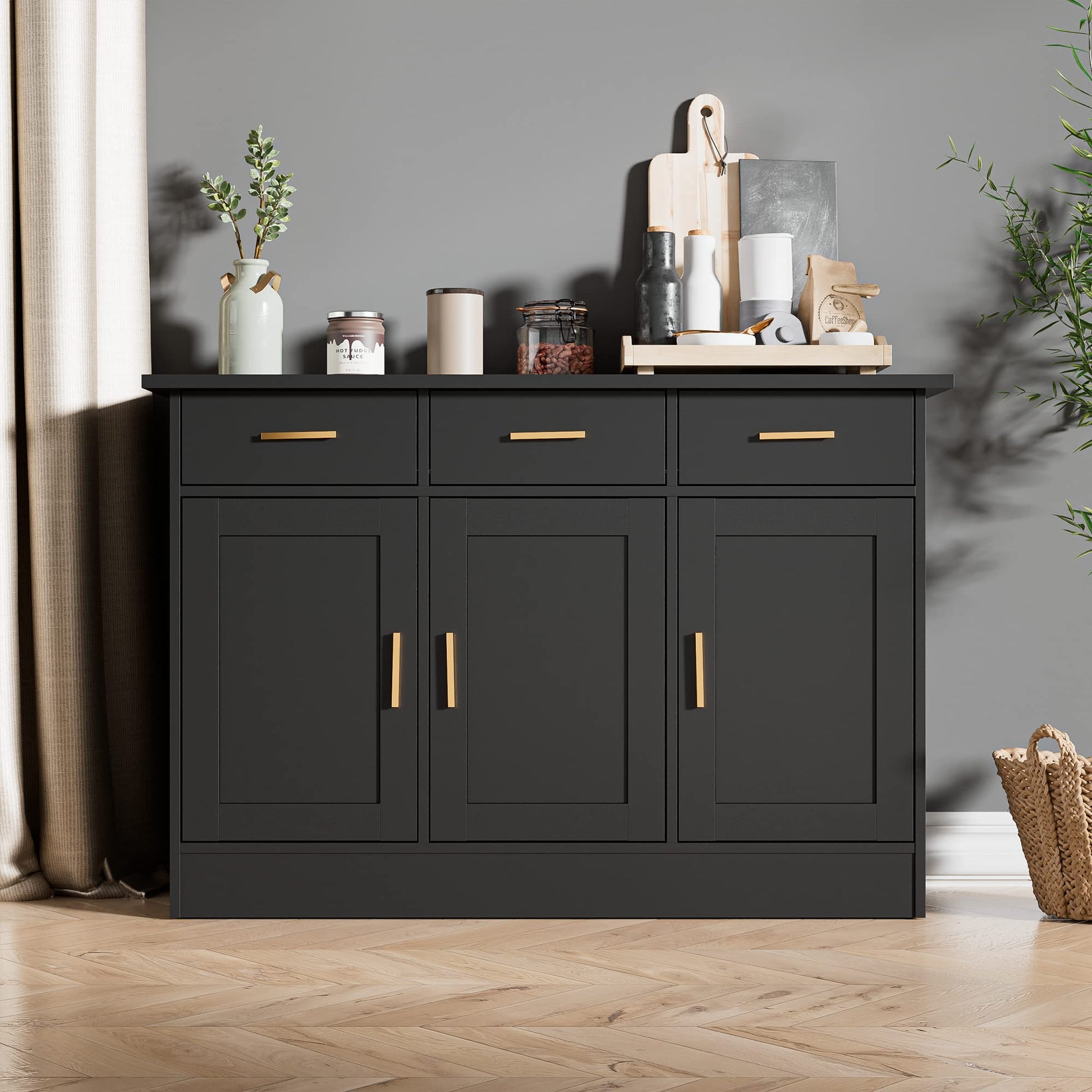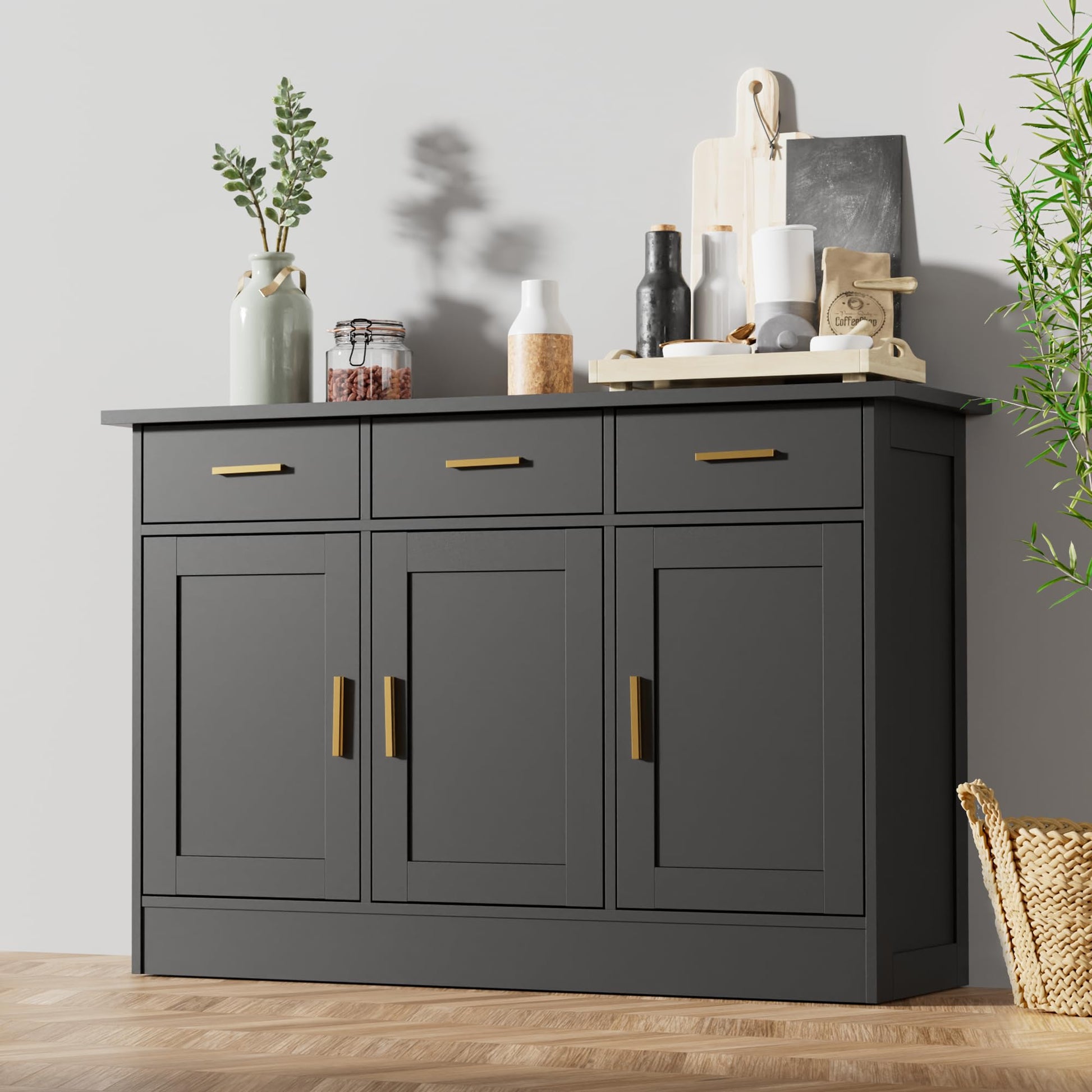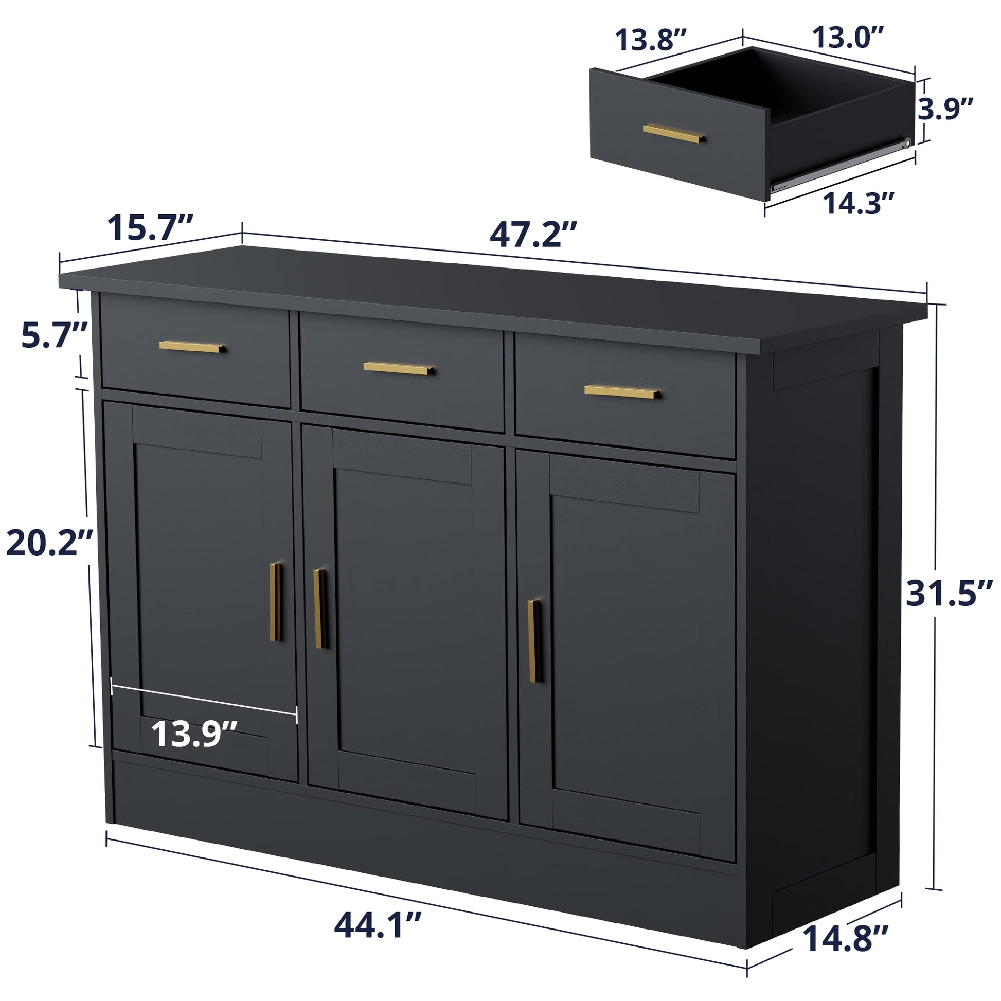- For creating a safe environment for your family, this kitchen buffet cabinet is designed with an anti-tip device so you don't have to worry about your family's safety anymore. Additionally, made of high-quality metal hardware, which ensures the durability and solidity of the buffet sideboard.