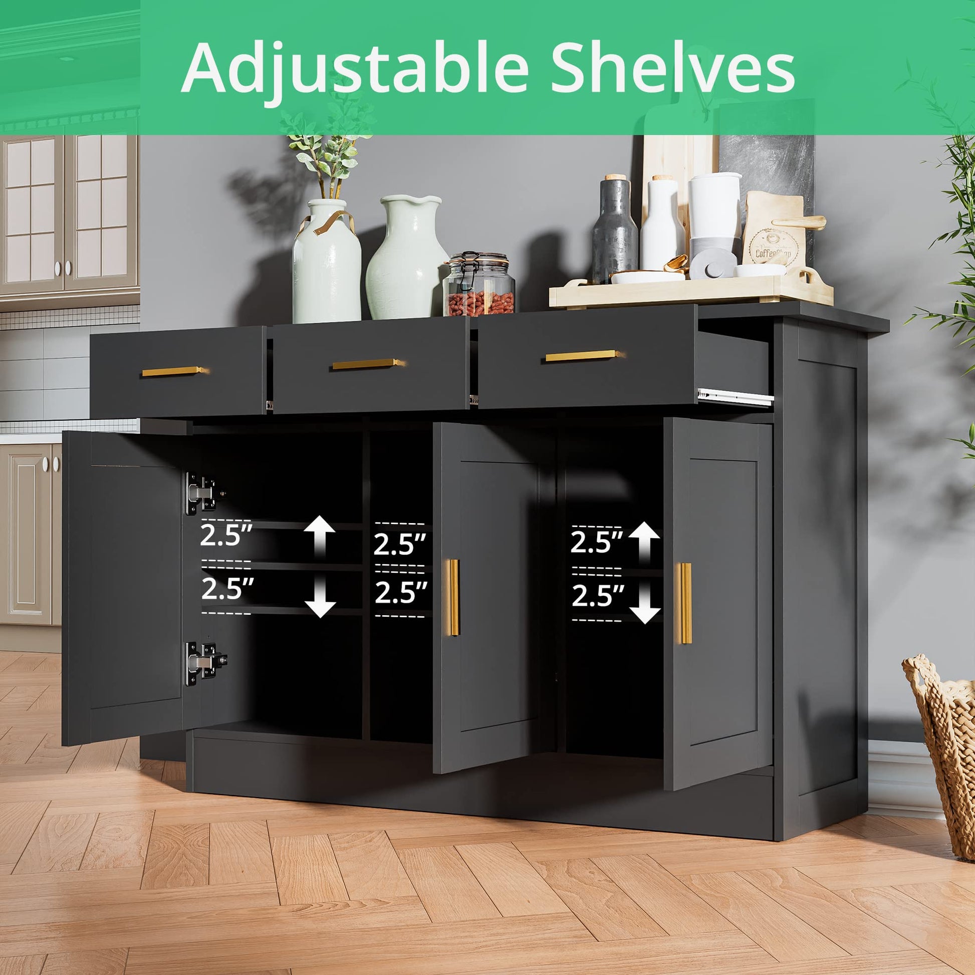 - There are 3 drawers and 3 cabinets with doors to ensure ample storage space for you. In addition, featuring 3 adjustable up-and-down 2.5-inch shelves, the kitchen storage cabinet is designed to provide you with plenty of private storage space for items of different sizes.