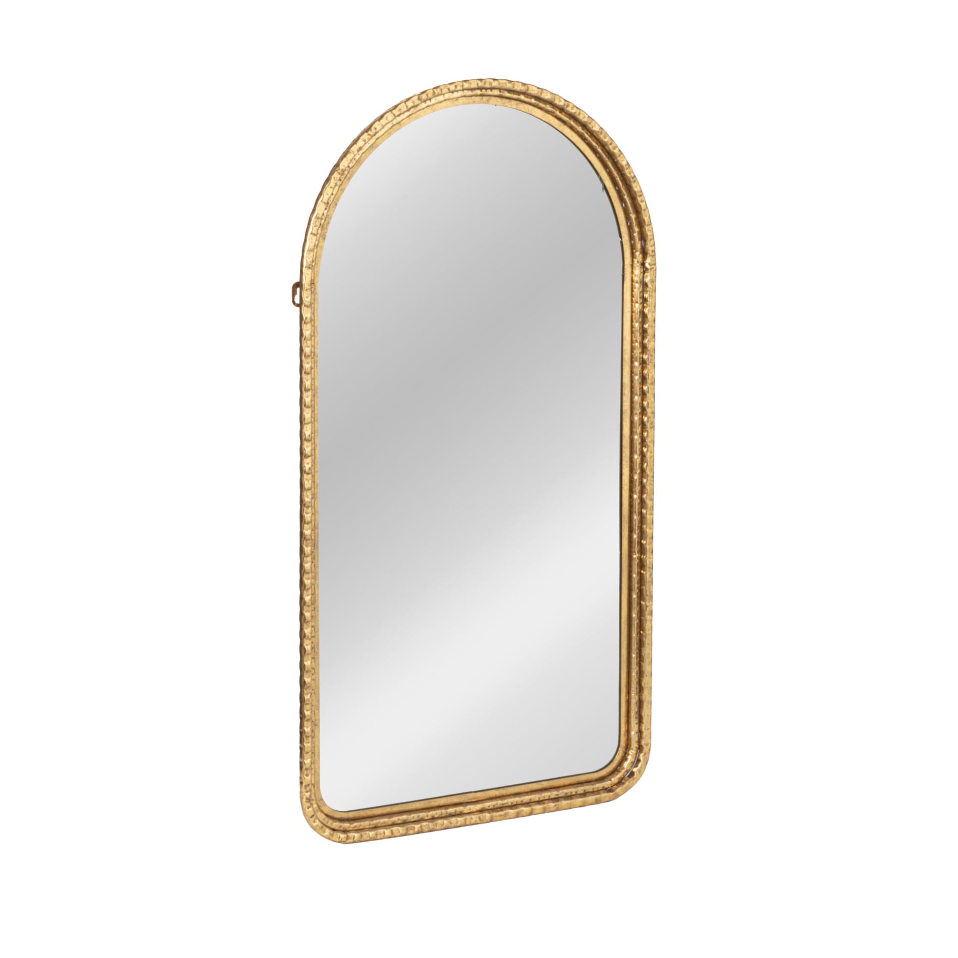- An elegant and chic mirror with a gold metal frame that forms a graceful arch at the top