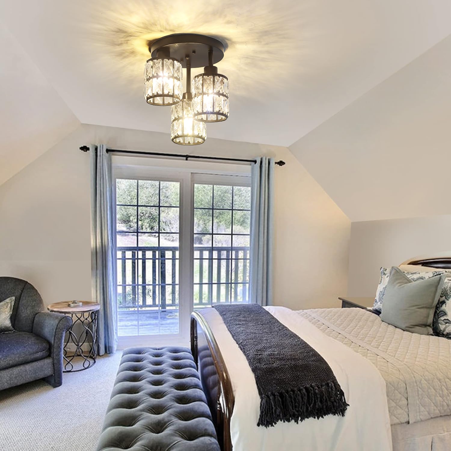 Semi Flush Mount Ceiling Light, 3-Light Close to Ceiling Light Fixture Black Small Crystal