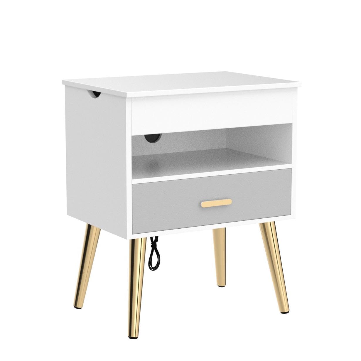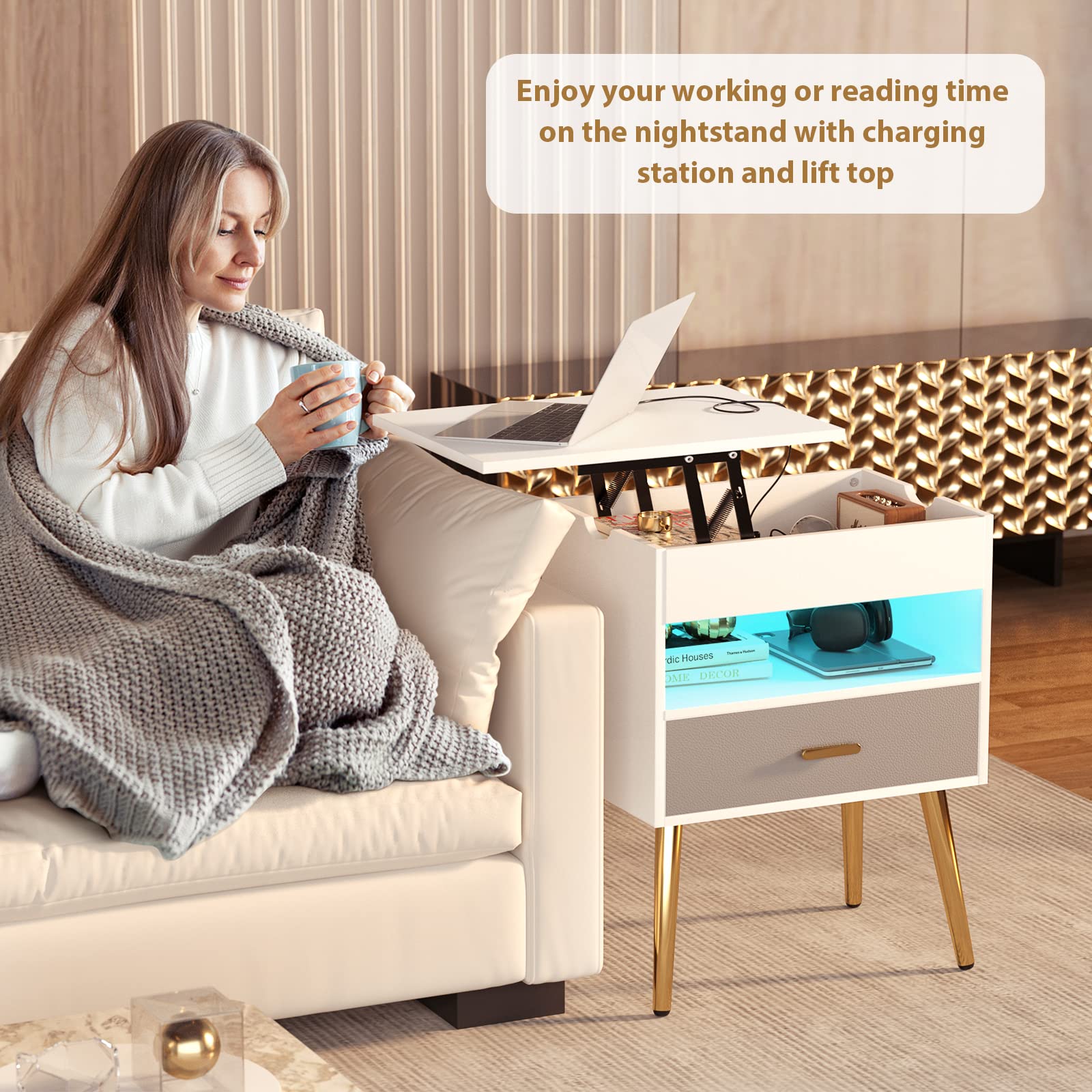 - This nightstand has 3-Tier storage space. The first tier is a hidden space under the lifting tabletop for storing private items. The second is a storage shelf, and the third is a drawer with a leather texture style. You can place your supplies such as books, glasses, snacks and table lamps according to your different storage requirements.