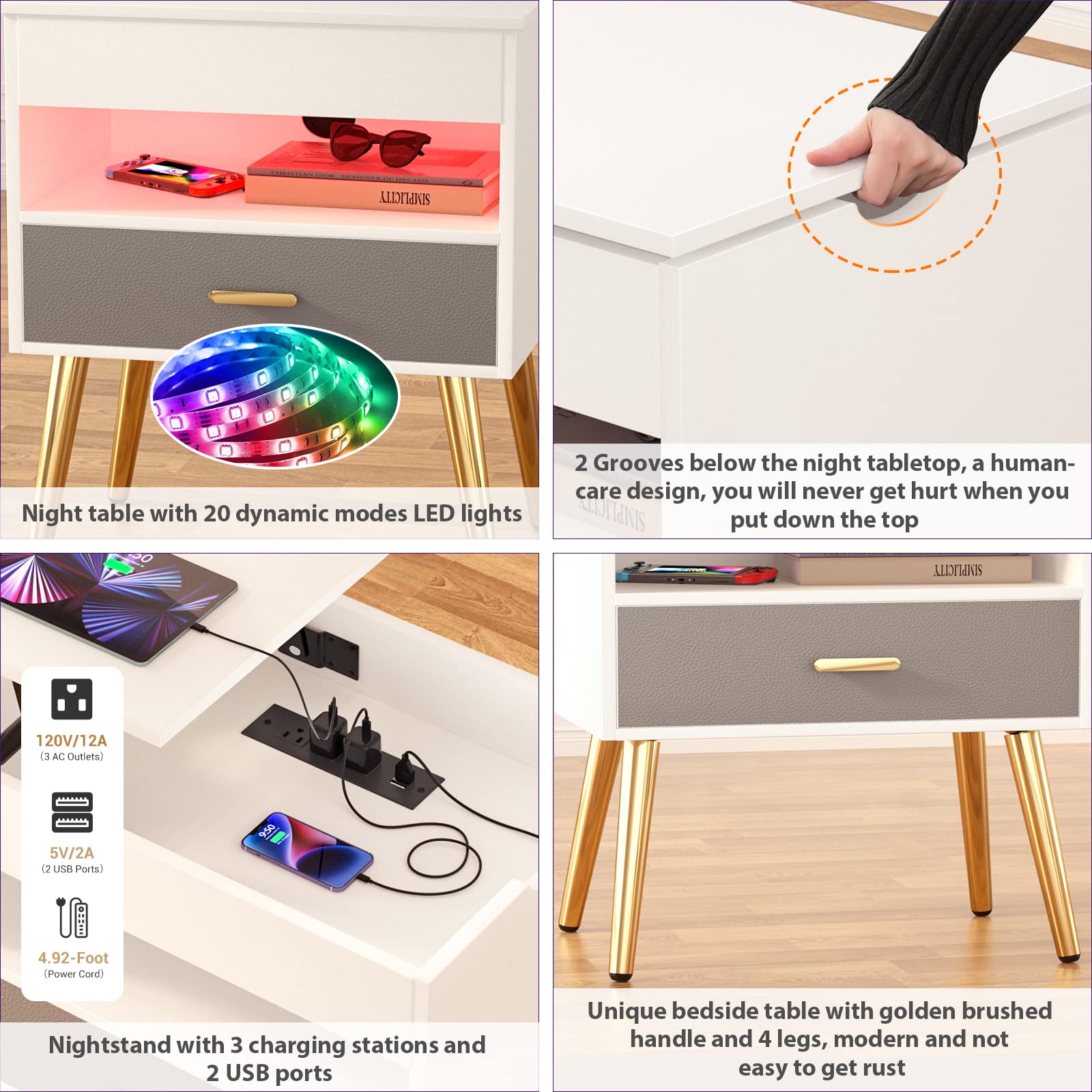 - The night stand is equipped with 6000+ colors of light strips, you can be manually controlled the color as you like. When you play music with the APP, the lights can also dance with the rhythm.You can create different atmospheres by adjusting the color, such as the happy and lively atmosphere at the party and the warm and romantic atmosphere before going to bed.