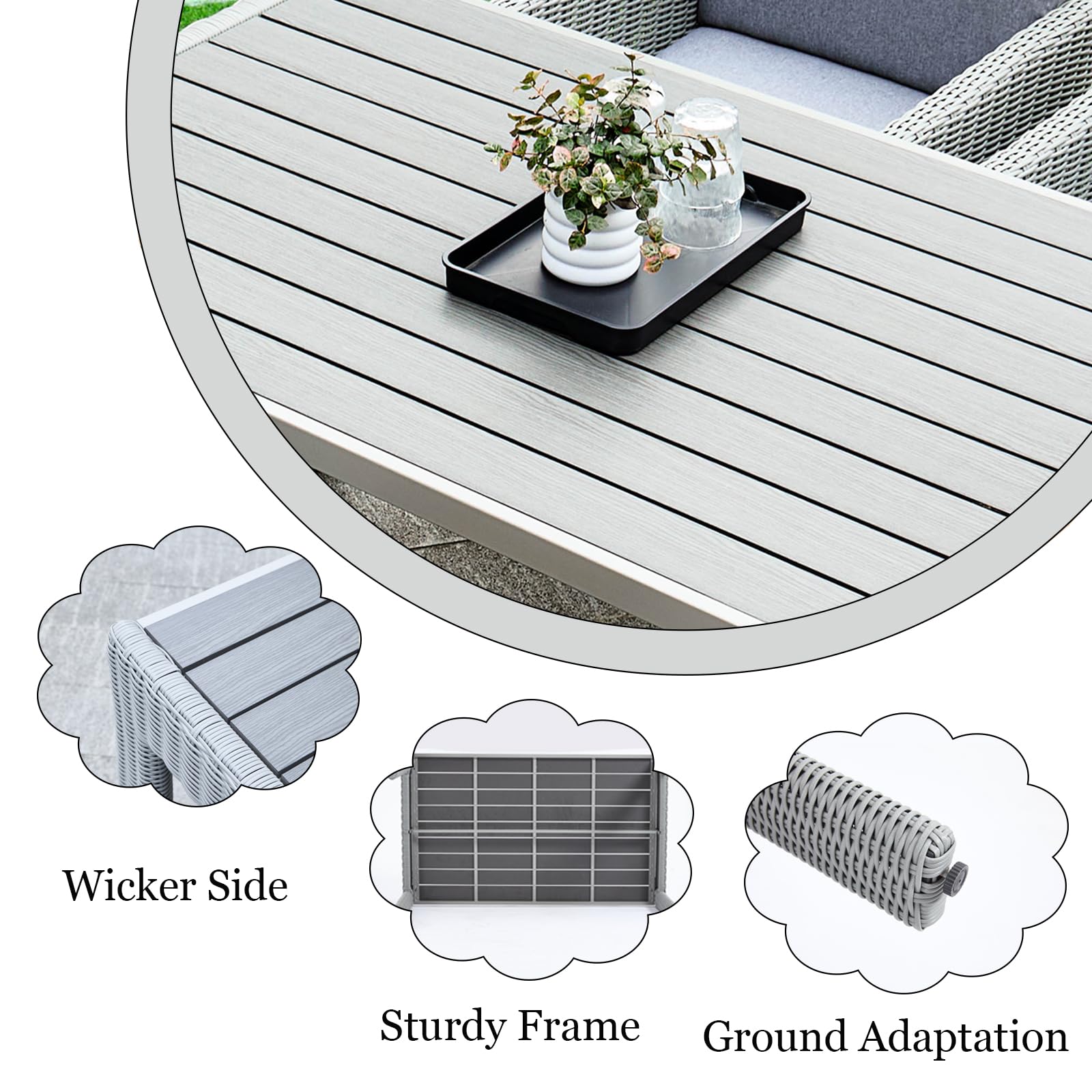 - Dining Chair Set: Outdoor dining set of 6 table tops with faux-plastic wood design, combined with neutral colors and clean lines, easy to integrate into a variety of outdoor spaces, perfect match for your garden, balcony or patio; 59.5"L x 36.2"W large dining table, providing you with plenty of dining space to enjoy a feast of delicious food