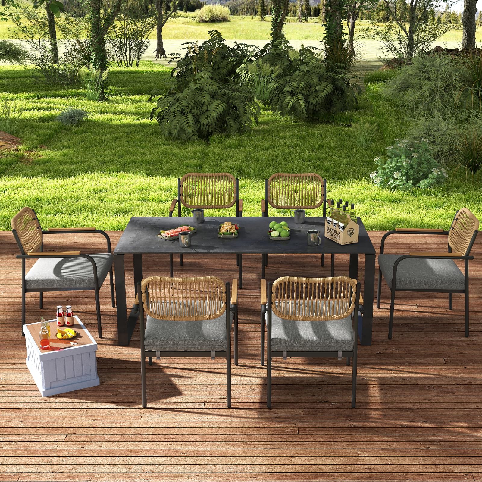 - Simple And Contrasting Designn: Outdoor dining chairs are simple and modern, rust-proof and durable. The back of the patio dining chair is rope design, with ergonomic armrests, providing a more comfortable using experience. Black polished finish prevents rusting, elegant and protective
