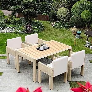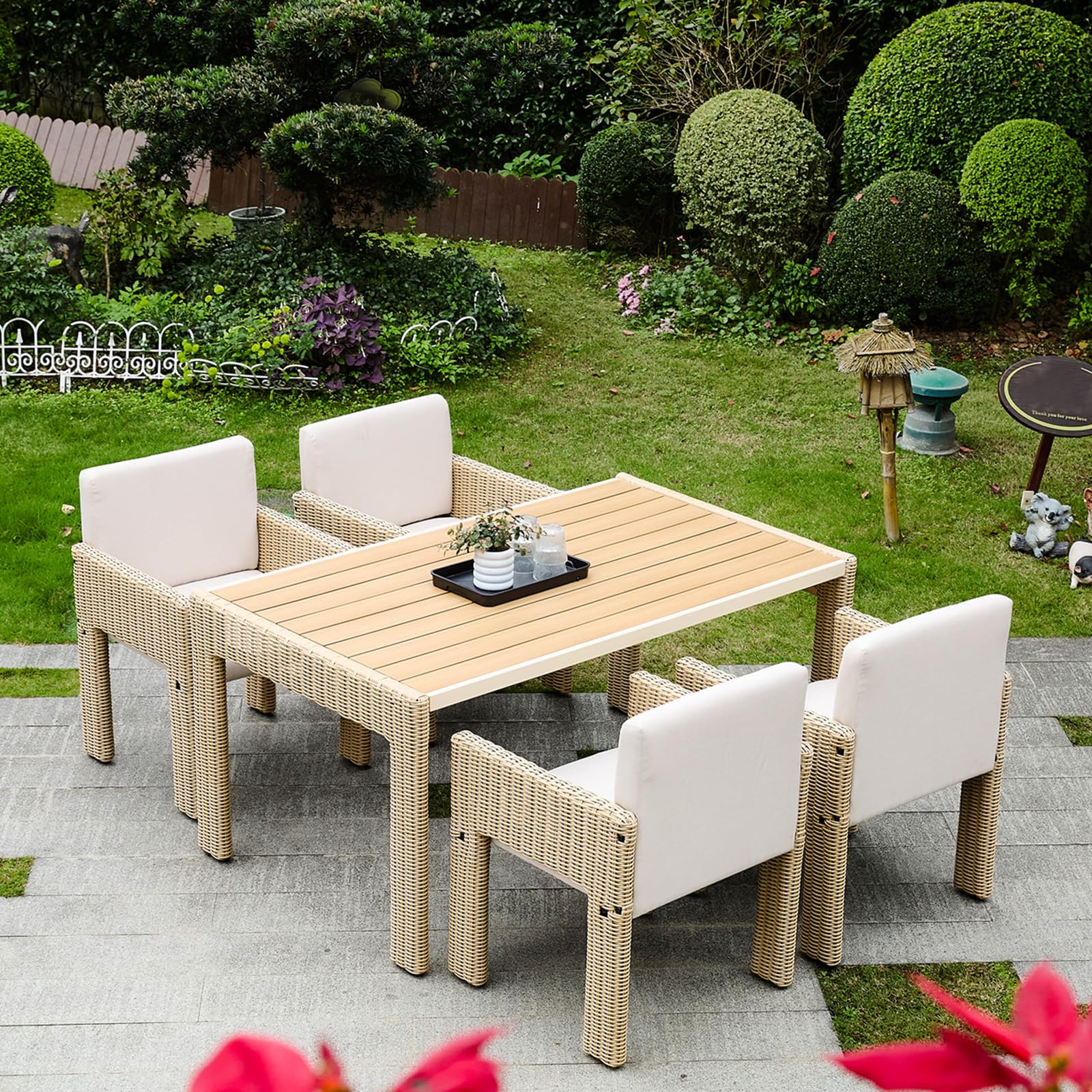 - Dining Chair Set: Outdoor dining set of 4 table tops with faux-plastic wood design, combined with neutral colors and clean lines, easy to integrate into a variety of outdoor spaces, perfect match for your garden, balcony or patio; 59.5"L x 36.2"W large dining table, providing you with plenty of dining space to enjoy a feast of delicious food