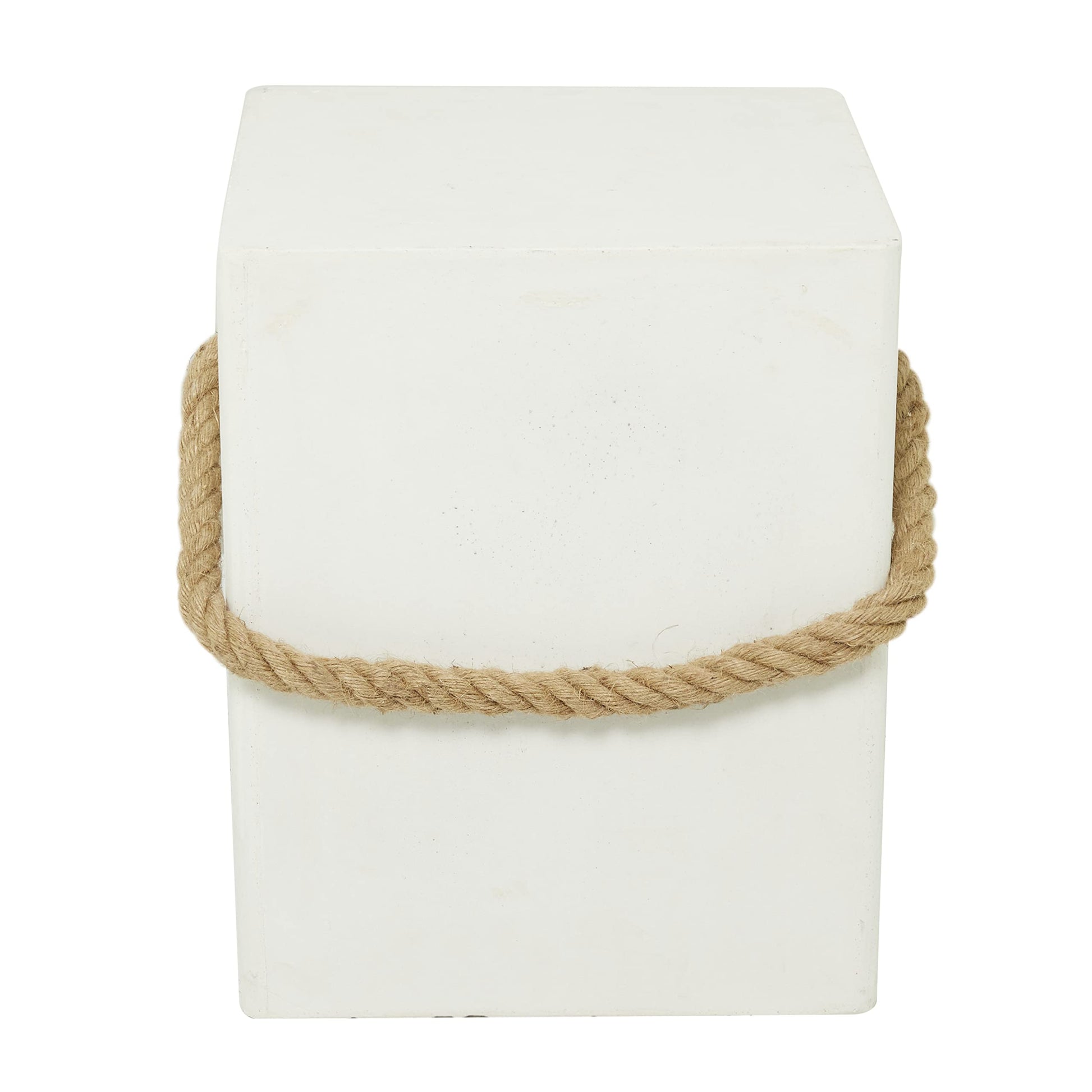 - FEATURES SQUARE OUTDOOR ACCENT TABLE An outdoor stool featuring a white square structure furnished with a brown burlap rope that serves as a handle