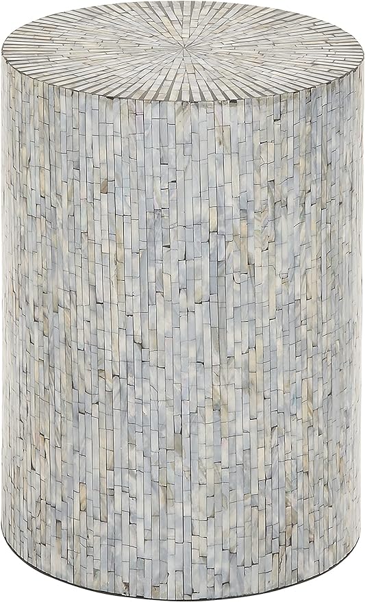 - GEOMETRIC CYLINDER SMALL TABLE As a mother of pearl accent table, it features a simple round form enhanced by vertical mussel shell mosaics, making it a striking statement piece in any contemporary setting