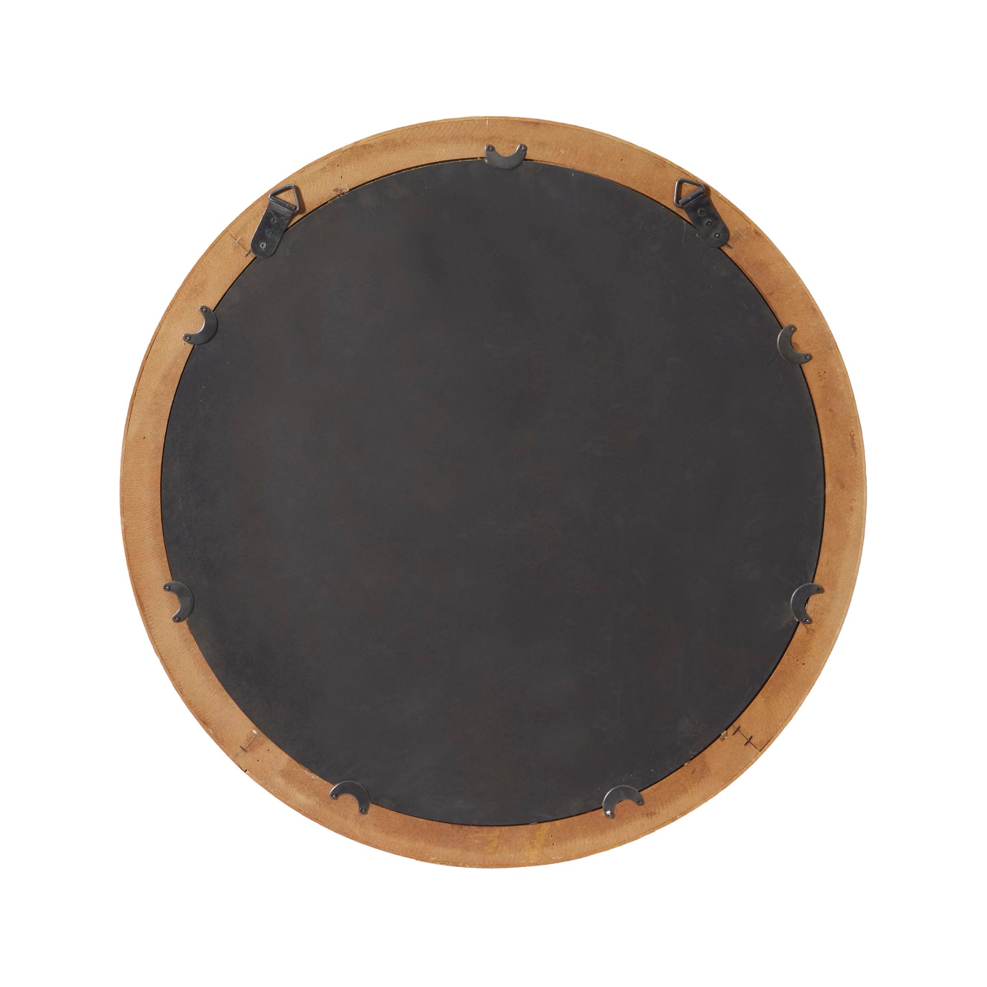 - ROUND ACCENT WALL MIRROR: Wall accent piece features a simple round vanity mirror with an elegant brown wooden frame