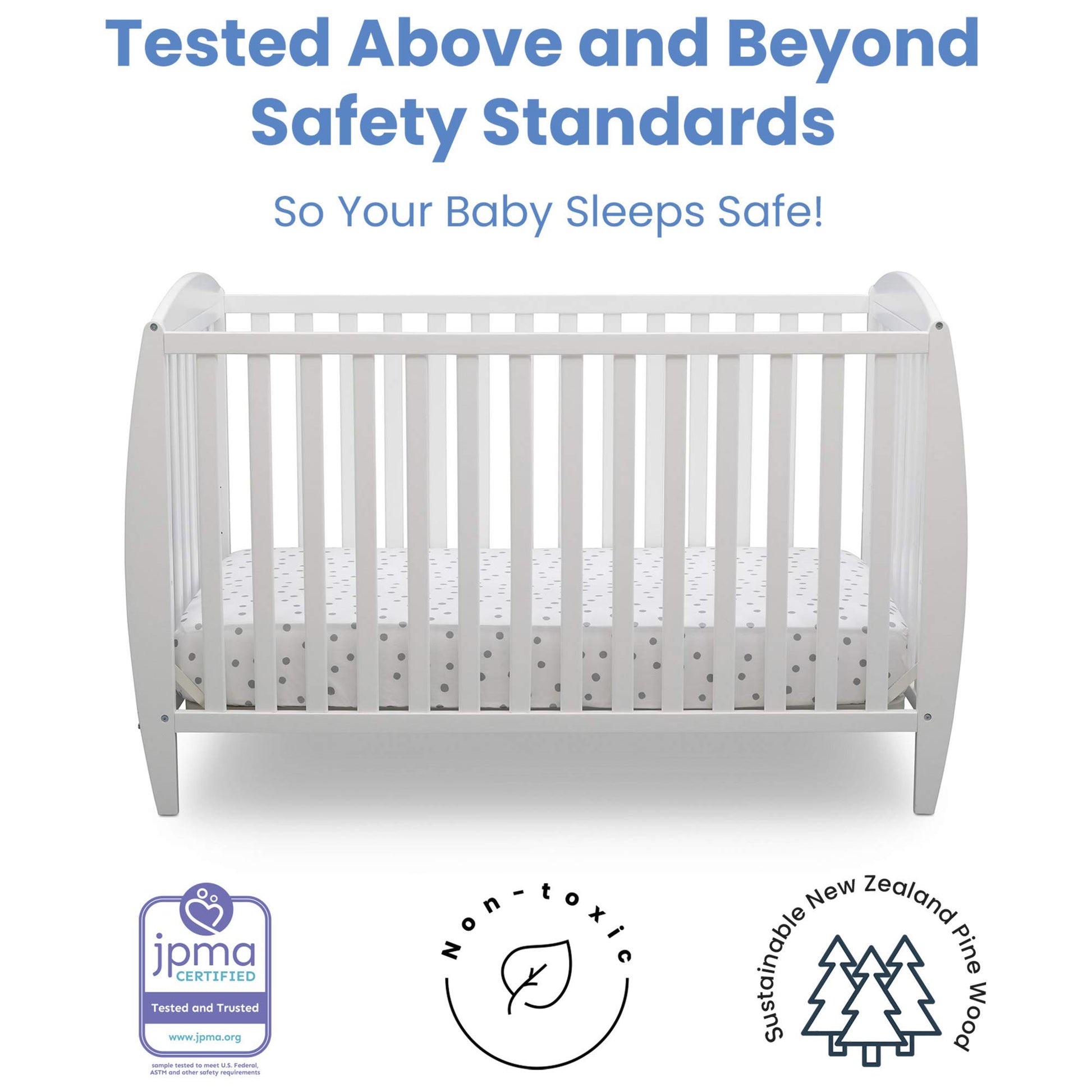 - WE PUT YOUR BABY'S SAFETY FIRST: This crib is JPMA certified to meet or exceed all safety standards set by the CPSC and ASTM; Tested for lead and other toxic elements to meet or exceed government and ASTM safety standards