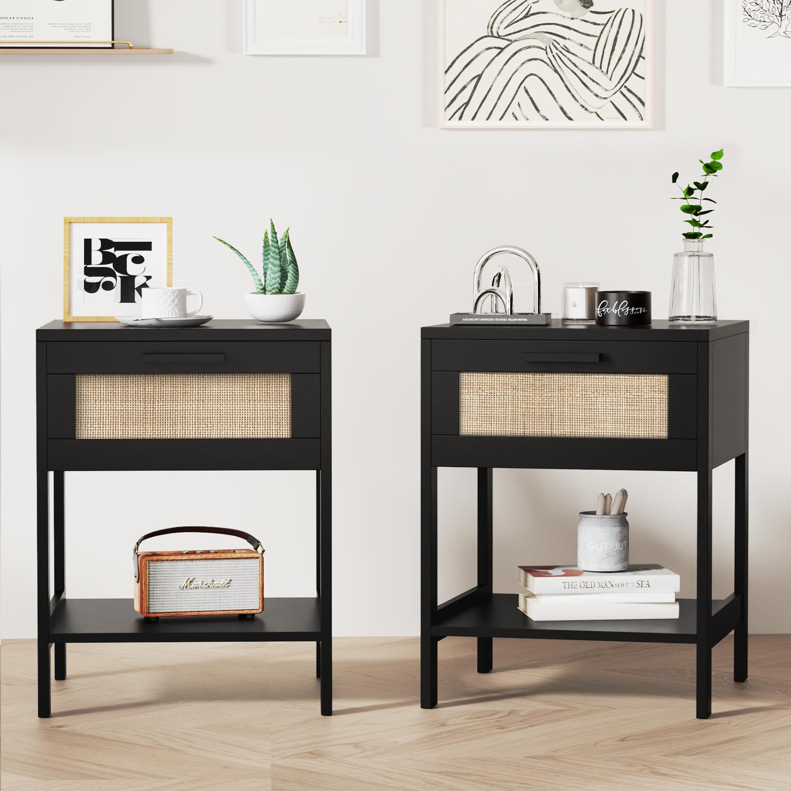 - The nightstand have a rattan decorated spacious drawer and open shelves that provide ample storage space. The surface of the side table is large enough to place a table lamp on it, as well as remote controls, cups, magazines, etc. The open top shelf is perfect for displaying picture frames and plants. Ideal for your bedroom and living room, making the space more tidy and orderly.