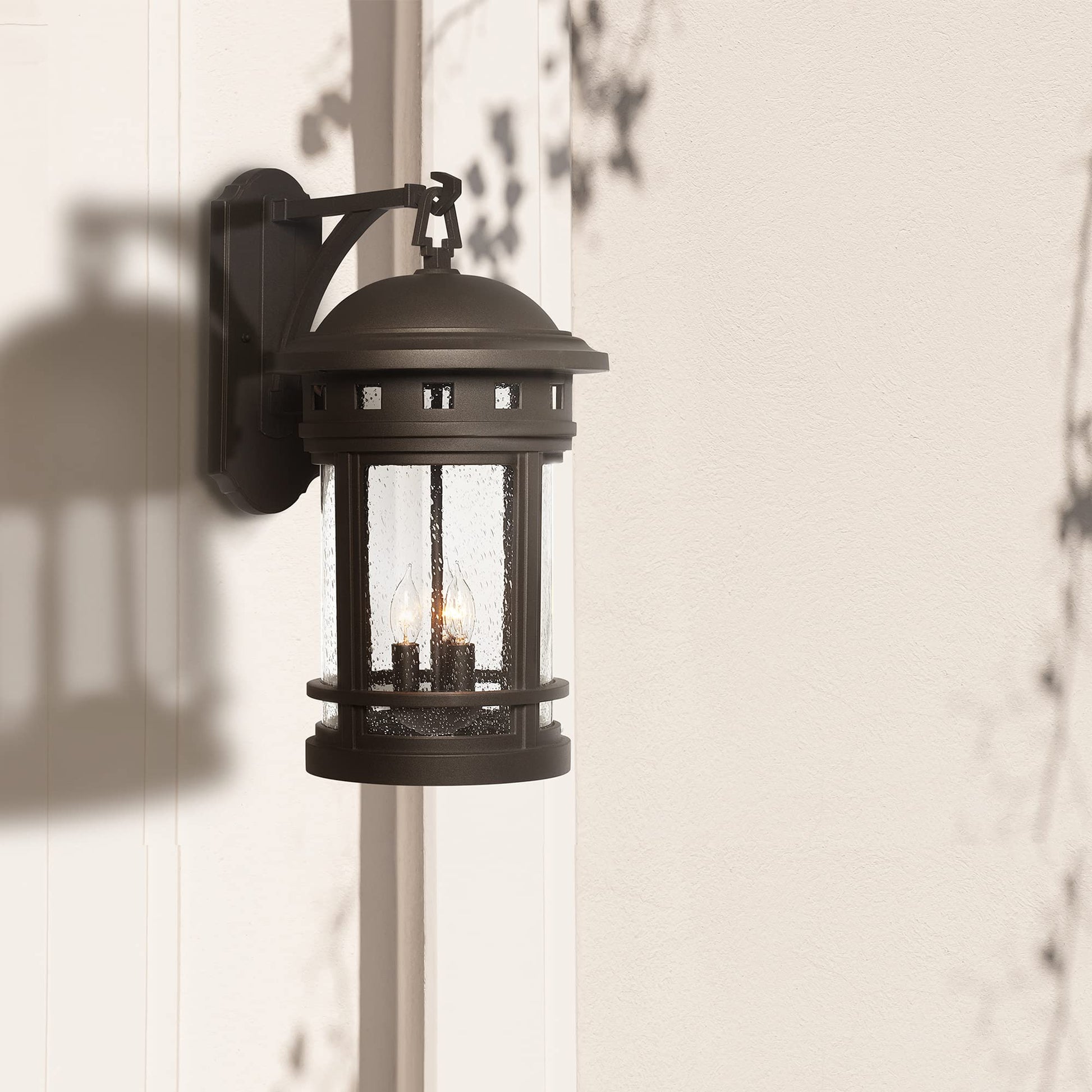 - OUTDOOR LANTERN SCONCE: Add superior illumination and a touch of elegance to your home's exterior with the Sedona wall mount lantern sconce. Our sconce lanterns feature a bold mission-style design and seedy glass shade which complements a wide range of home settings, and our sconce lanterns are treated to prevent pitting, tarnishing, and discoloration so that they will provide welcoming and safe lighting for years to come