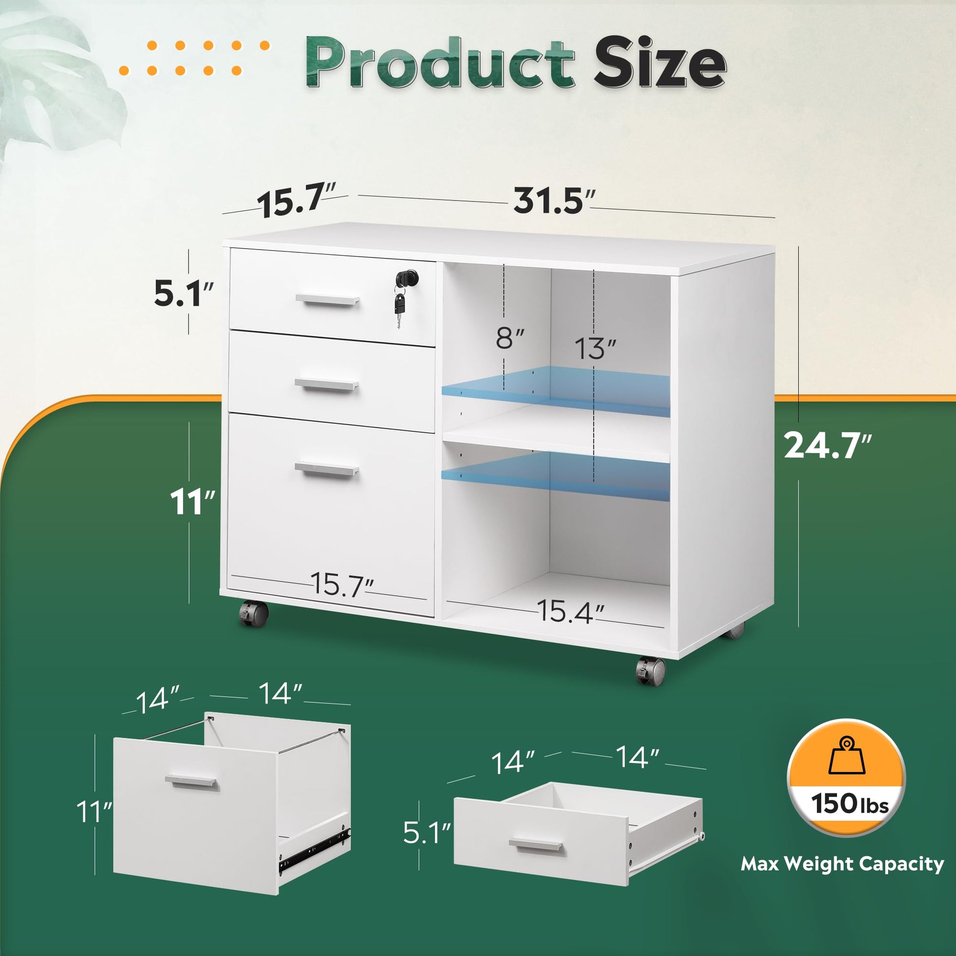 - HEAVY DUTY & EASY ASSEMBLE: This solid constructed office lateral cabinet with evenly distributed maximum weight capacity of 150lbs. Overall dimension: 31.3"W x 15.7"D x 24.7"H (including casters), easy assembly with tools and instruction included. If you have quality problems, just contact us.