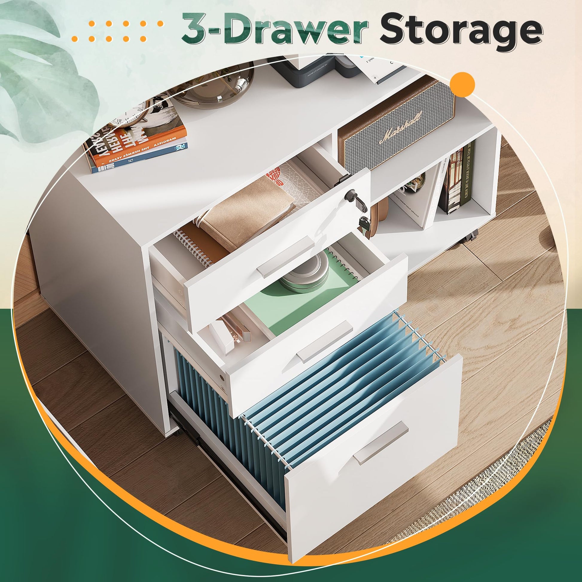 - 3 DRAWERS WITH LOCK & LARGE OPEN STORAGE: 2 top small drawers provide plenty of storage space for small items. Bottom drawer keeps hanging letter, A4 size files organized and extends fully for easy access. Single lock system secures top 1 drawers, keeps your business private.